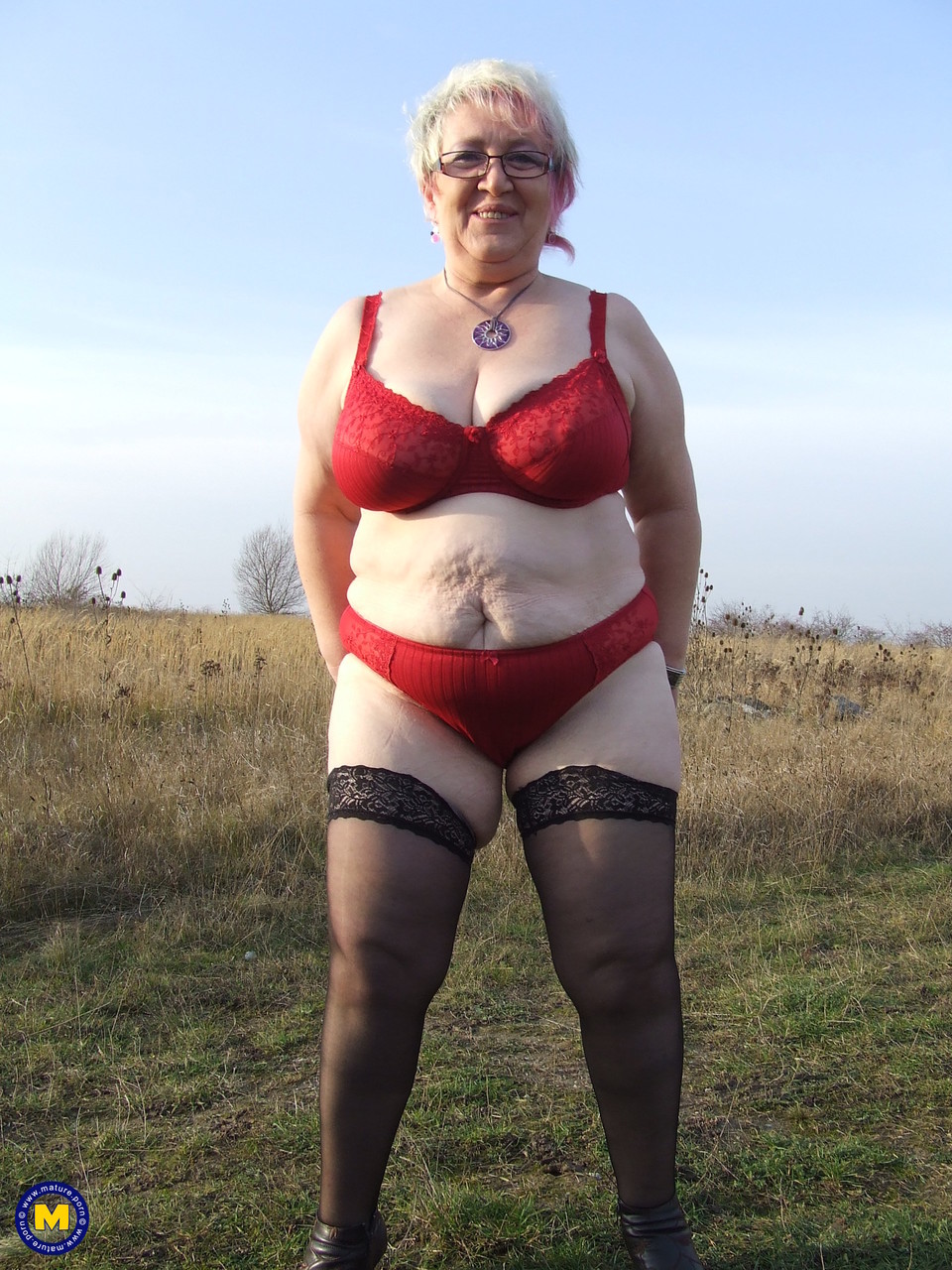 Wild Granny With Huge Saggy Tits Silke Poses In Lingerie & Masturbates Outside - Photo 8 / 20