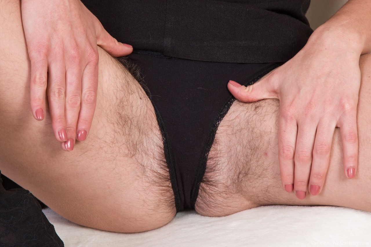 Smiley amateur MILF Katie Z teases in lingerie, licks her hairy armpits, then spreads wide to flaunt a thick brunette bush in close-up hairy pussy action.