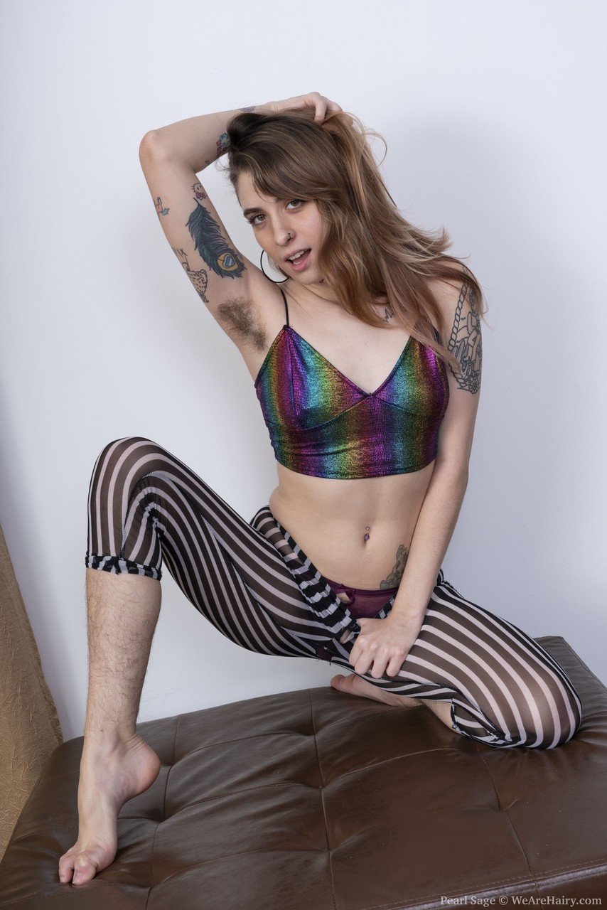Tattooed Russian amateur Pearl Sage flaunts her all-natural, very hairy pussy, big feet and juicy ass in a steamy solo spread.
