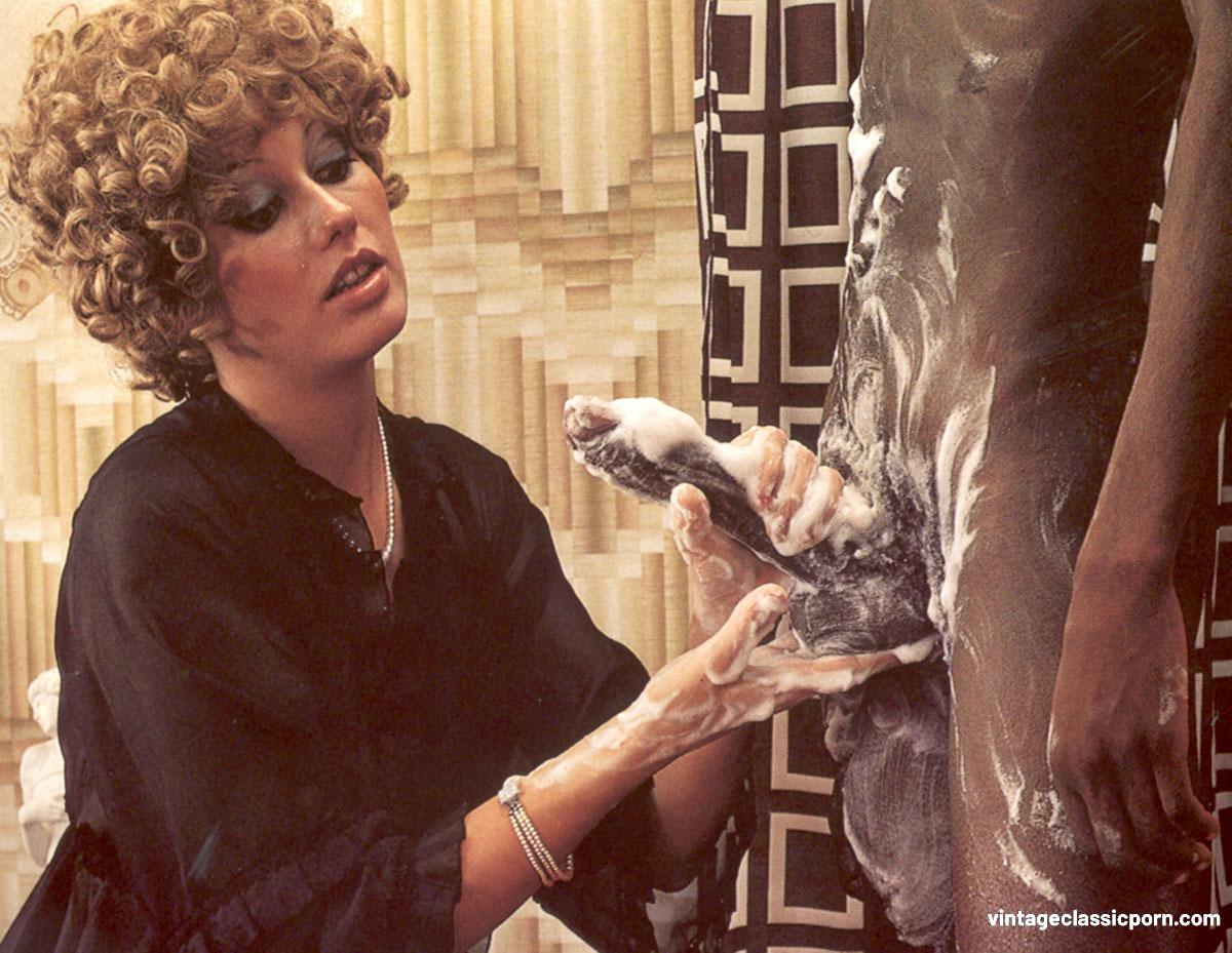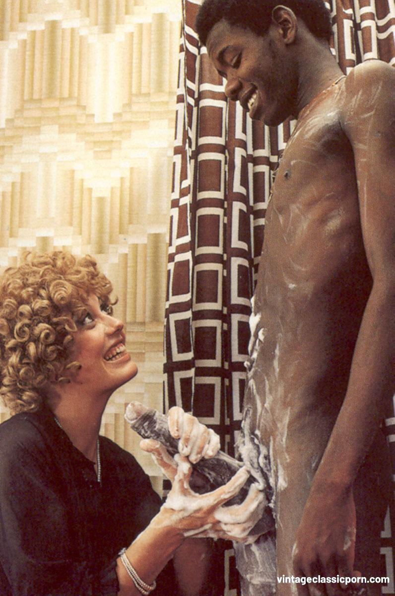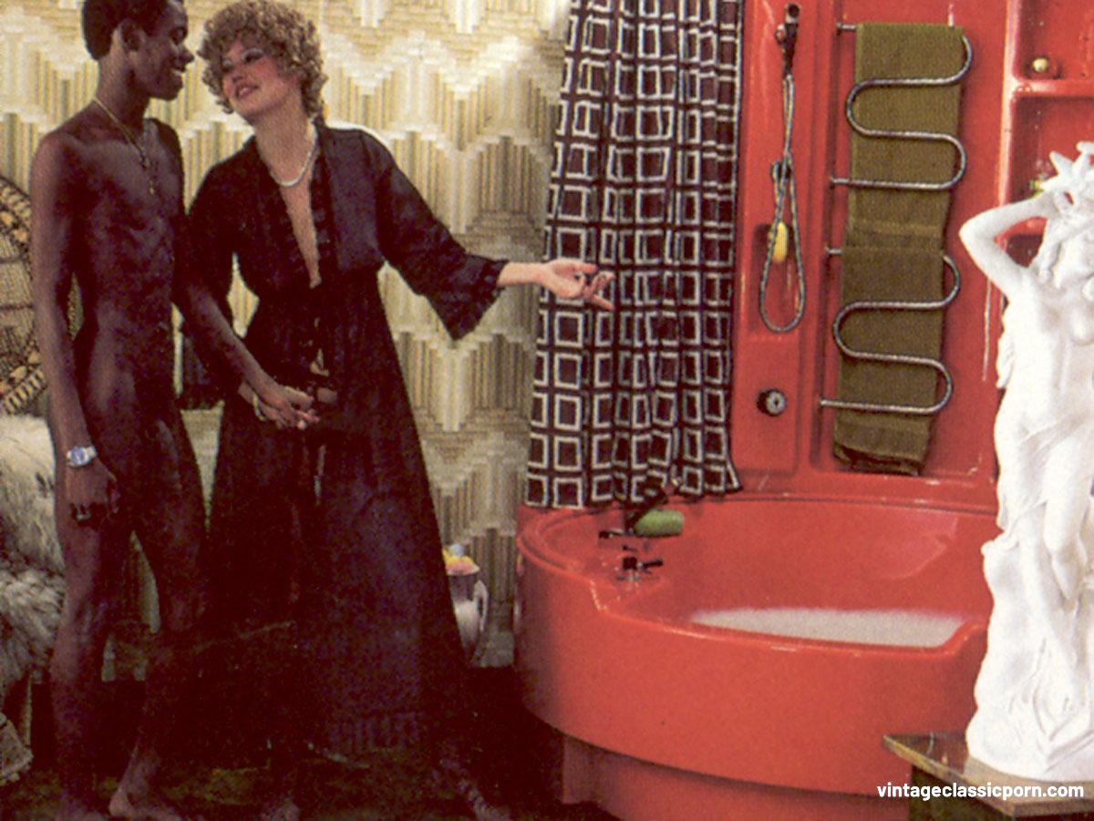 Vintage curly-haired MILF rides monster black dick in retro stockings, hairy pussy stretched by huge cock in classic interracial hardcore bath scene.