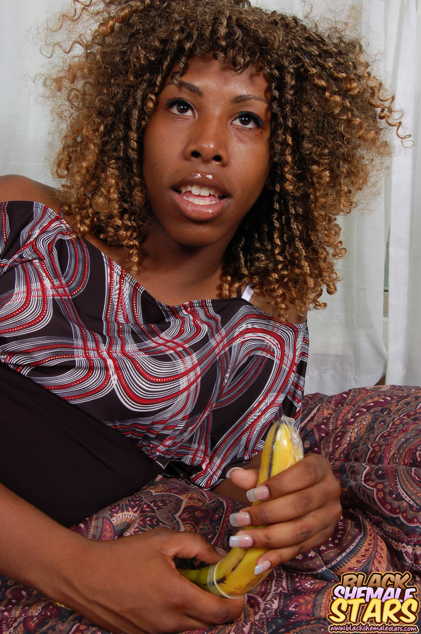 घुंघराले बालों वाली काली शीमेल करीमा केले के डिल्डो के साथ छेड़खानी करती है, प्यारी काली ट्रांससेक्सुअल सिस्सी अकेले में जोर से झड़ती है।