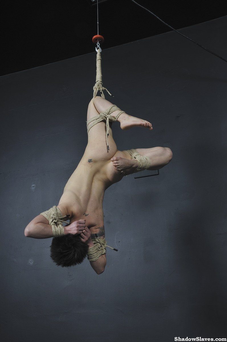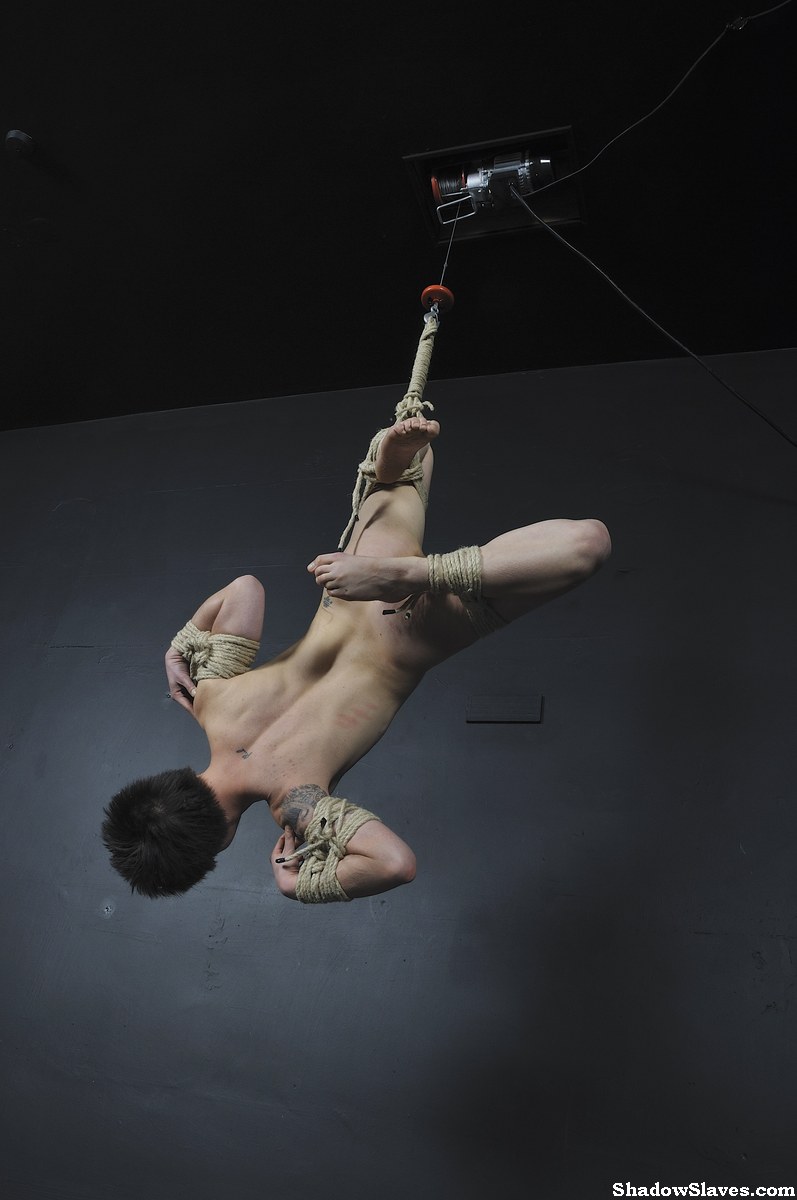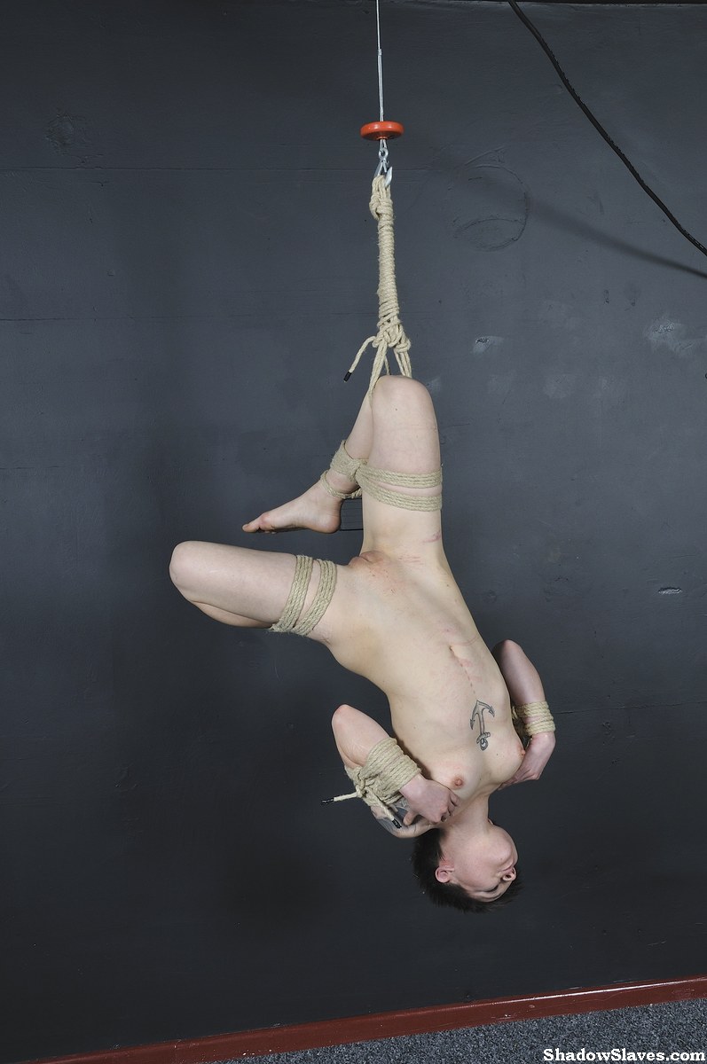 स्याही से ढकी एशियाई लड़की, कमरे की छत से लटकती हुई, उसके छोटे स्तन हिल रहे हैं क्योंकि रस्सियाँ उसके टैटू वाले पैग अस को काटती हैं - उसके छोटे बालों वाले बीडीएसएम आत्मसमर्पण को देखें।