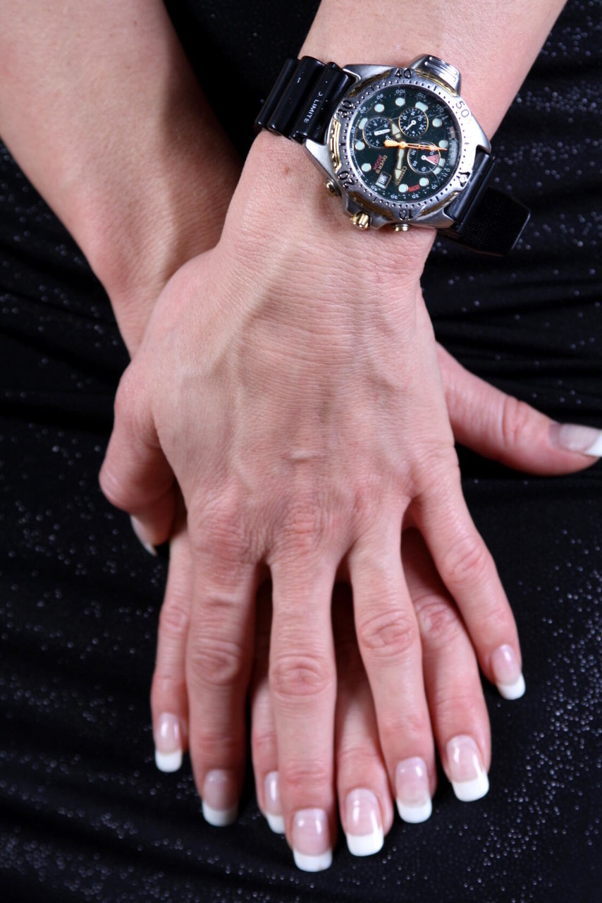 सुनहरे बालों वाली टिफ़नी काली पोशाक में सिटीज़न डाइवर घड़ी पहने - गैलरी जानकारी