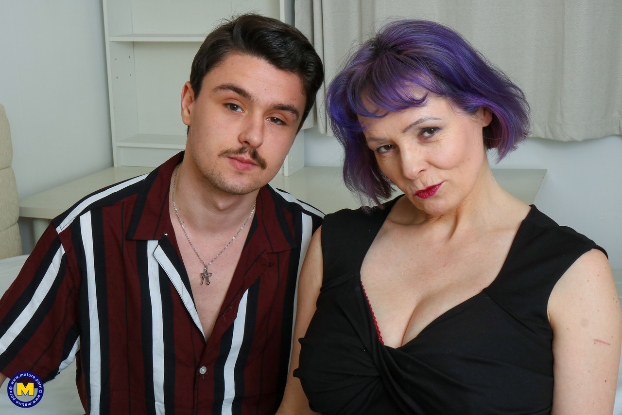 बैंगनी बालों वाली बड़ी छाती वाली वृद्ध महिला खिलौना लड़के के बड़े लिंग को चूसती और चोदती है - गैलरी जानकारी
