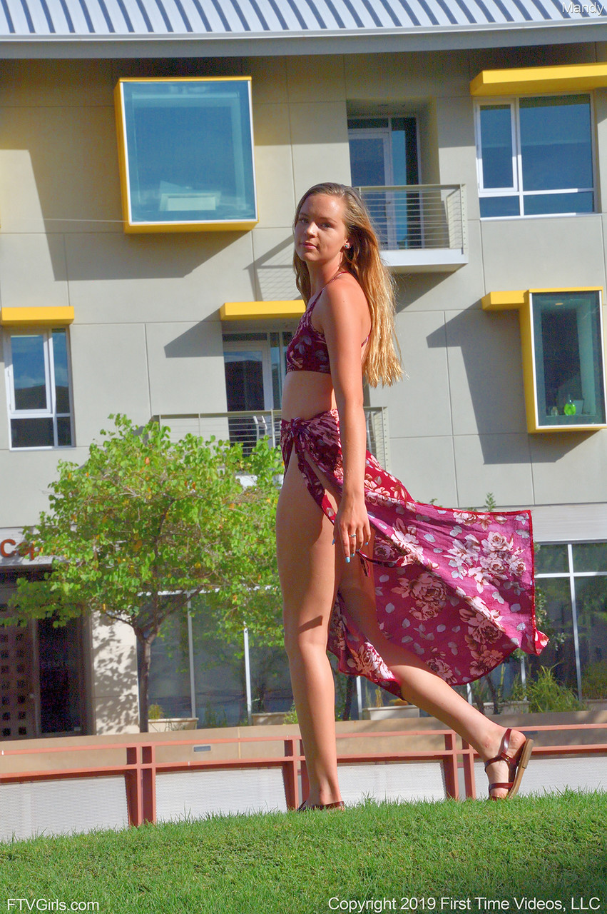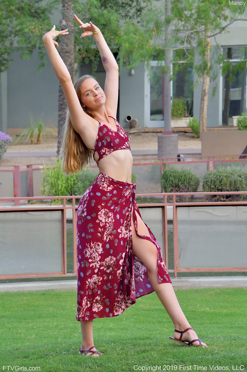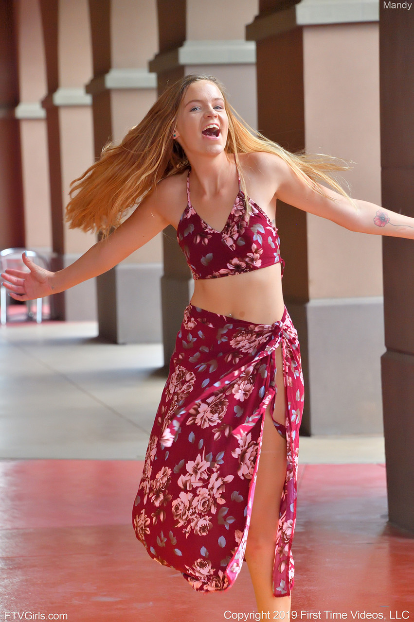 लाल बालों वाली शौकिया मैंडी स्कर्ट और सैंडल में बाहर मोहक अदाओं से पैरों और परफेक्ट बॉडी दिखाती है—नॉन-न्यूड गैलरी, खूबसूरत मॉडल।