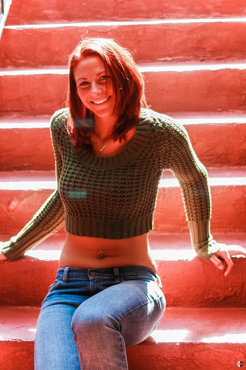 अविवाहित लाल बालों वाली सुंदरी बाहर व्यक्तिगत फोटोशूट में टाइट जींस और लंबी टांगें दिखाती है—सुंदर, कपड़ों वाली छेड़खानी, छोटे बालों वाली प्यारी के साथ Bentbox पर।