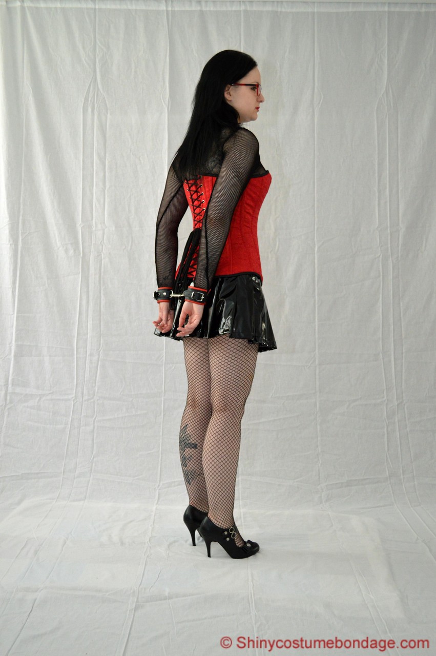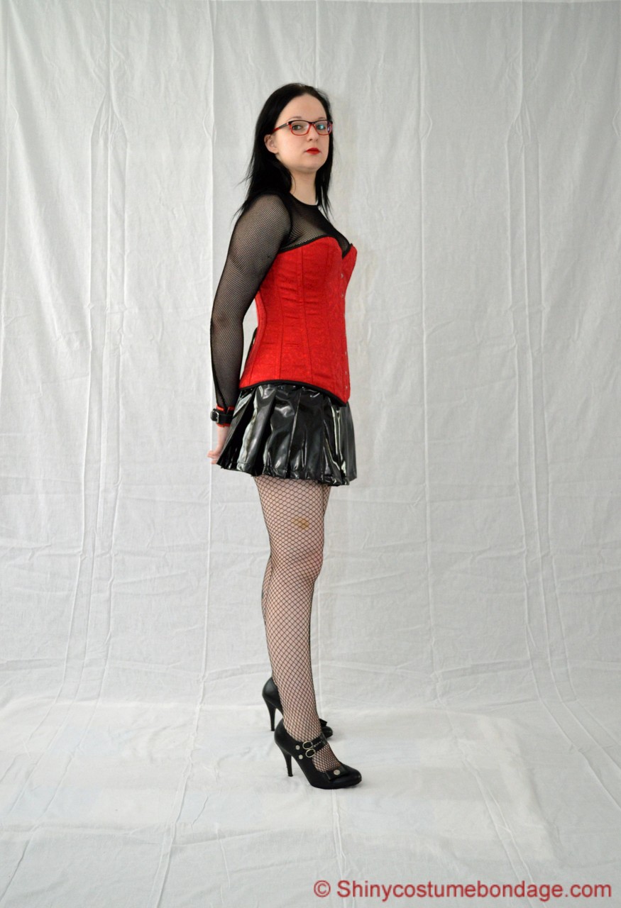 गीकी लड़की को चमकदार लेटेक्स मिनीस्कर्ट, चश्मा और पैंटीहोज़ में हॉगटाइड किया गया; हाई-हील BDSM बॉन्डेज टीज़, कपड़े पहने नर्ड फ़ेटिश, लंबी टांगें बंधी हुई, नॉन-न्यूड किंक।
