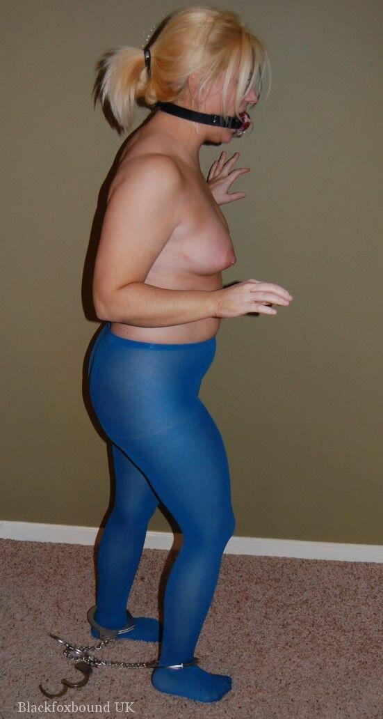 मोटी सुनहरे बालों वाली महिला हाथकड़ियों से बंधी हुई नीले होज में ऊपर के कपड़े के बिना मुंह बंद - गैलरी जानकारी