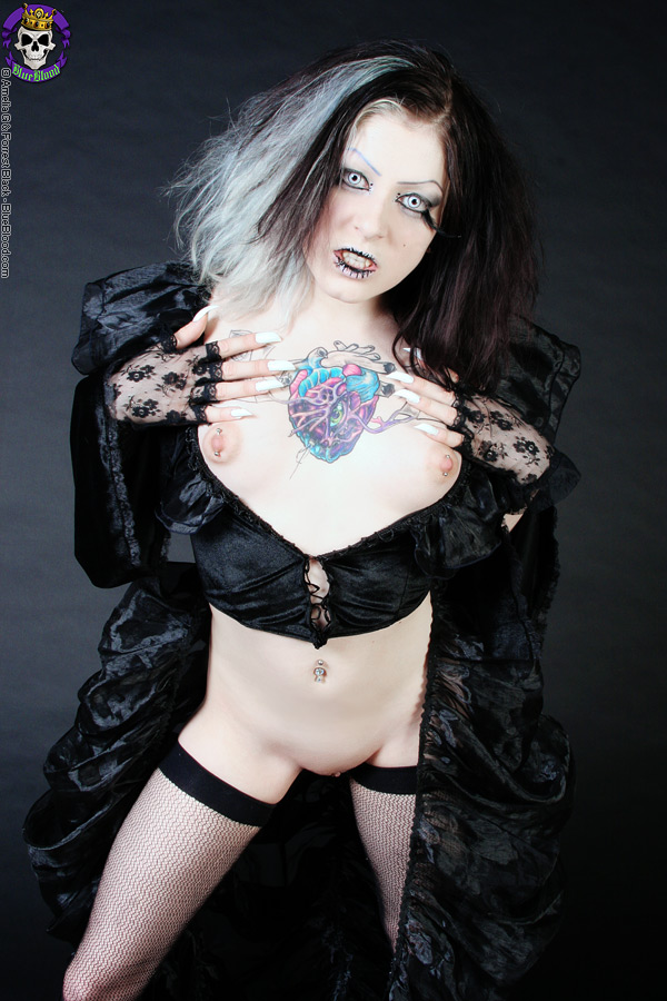 गोथ वैम्पायर मैड सोफी डार्क कॉसप्ले में स्ट्रिप्स, शेव्ड योनि, छोटे स्तन, टैटू वाली त्वचा, स्टॉकिंग्स, हील्स को बेनकाब करती है; सुंदर चेहरा एकल फेटिश शो में चुनौती देता है।
