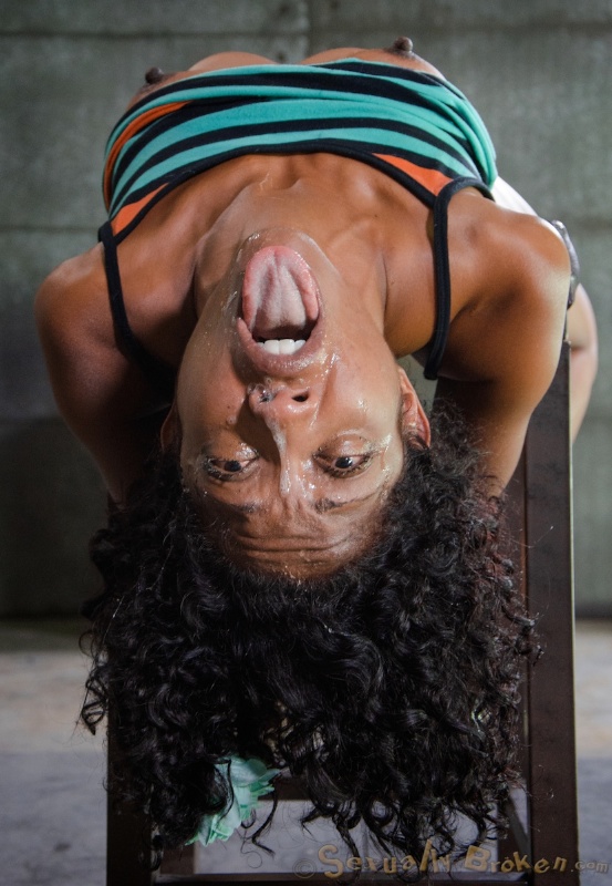 आँखों पर पट्टी बाँधी हुई काली लड़की लोटस लेन कुर्सी पर बाँधी गई गहरा गला और चेहरे पर शॉट के लिए - गैलरी जानकारी