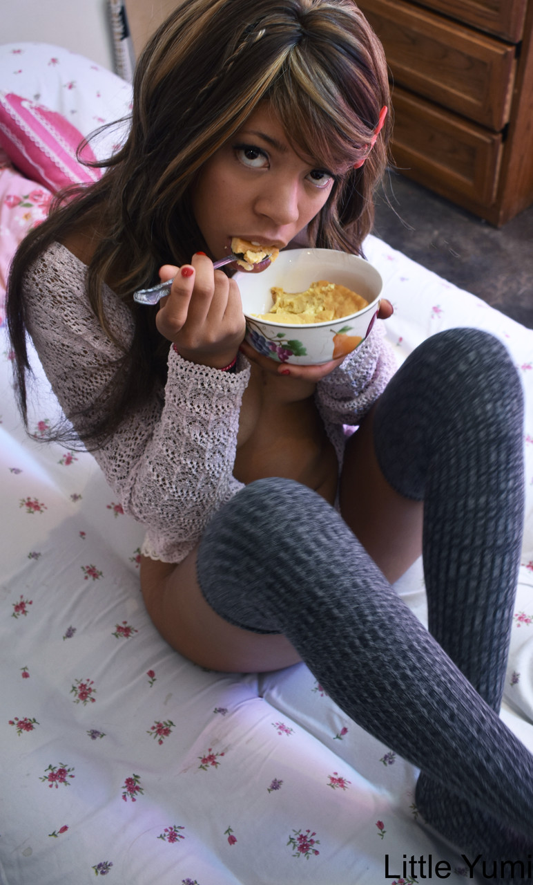 ब्लैक बेब छोटी युमी ग्रे मोज़े में बिस्तर पर खाते हुए अपने स्तन दिखाती है - गैलरी जानकारी