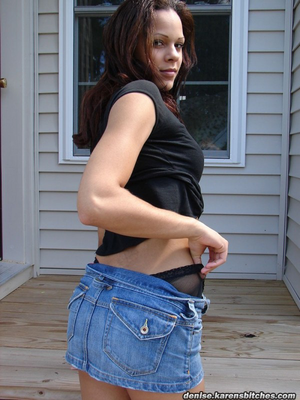 गोरी शौकिया महिला लकड़ी की सीढ़ियों पर डेनिम स्कर्ट में अपसर्ट पैंटी दिखाती है