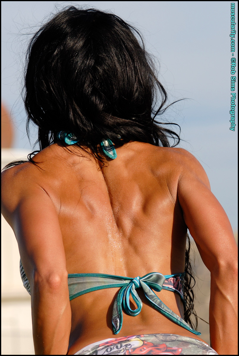 ब्रूनेट बॉडीबिल्डर शांदी माटिक समुद्र तटीय पोशाक में बाहर पोज़ देती हैं - गैलरी जानकारी