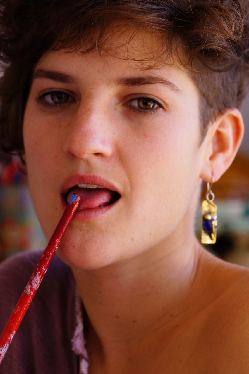 छोटे बालों वाली कलाकार इज़ाबेला ने अपने बालों वाले योनि में पेंट ब्रश गहराई से डाला