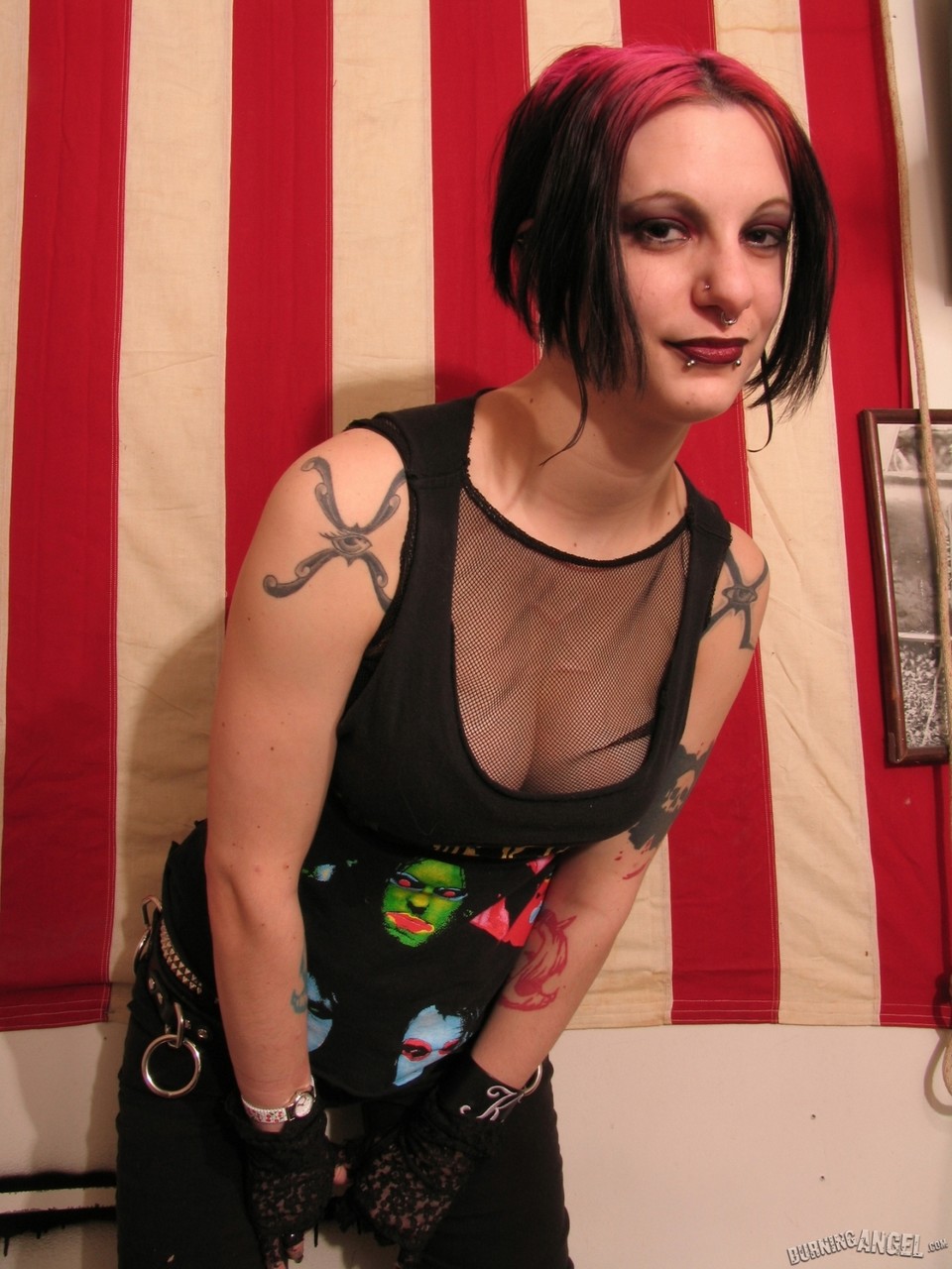 गॉथ गर्ल अपने बड़े स्तन और भारी पियर्सिंग वाली चूत दिखाने के लिए कपड़े उतारती है - गैलरी जानकारी