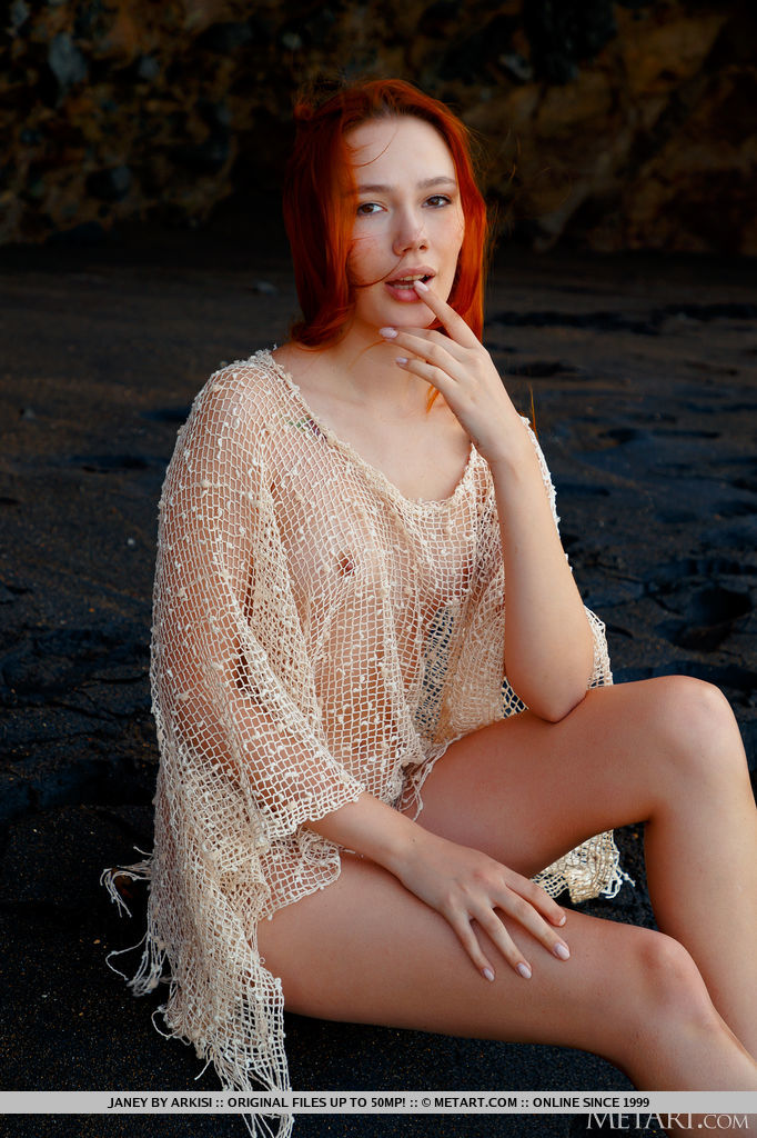 लाल बालों वाली किशोरी जेनी काली रेत पर पूरी तरह नंगी हो जाती है - गैलरी जानकारी