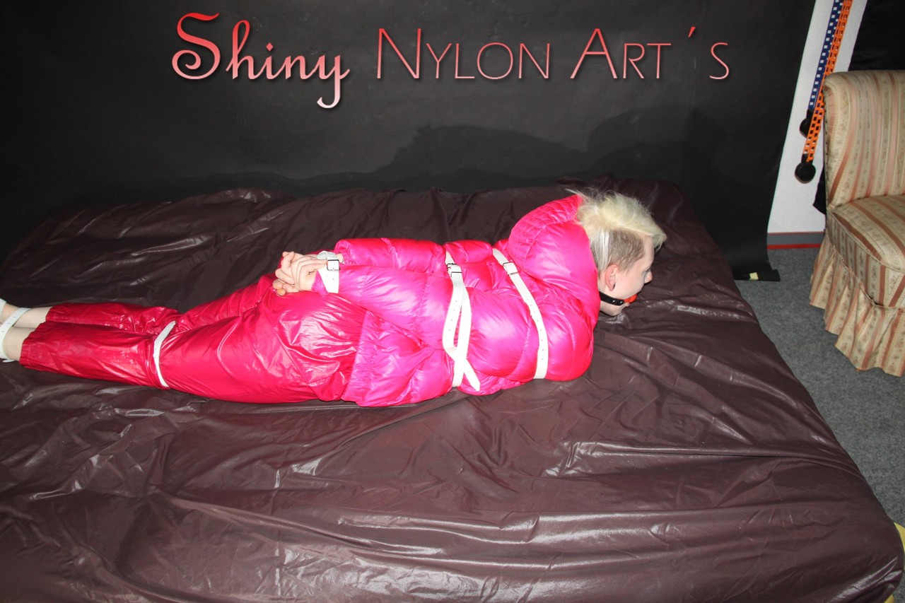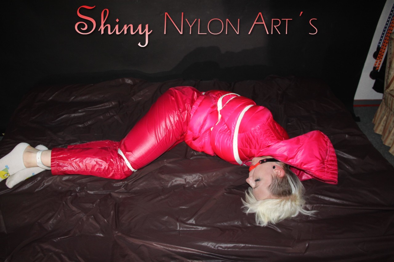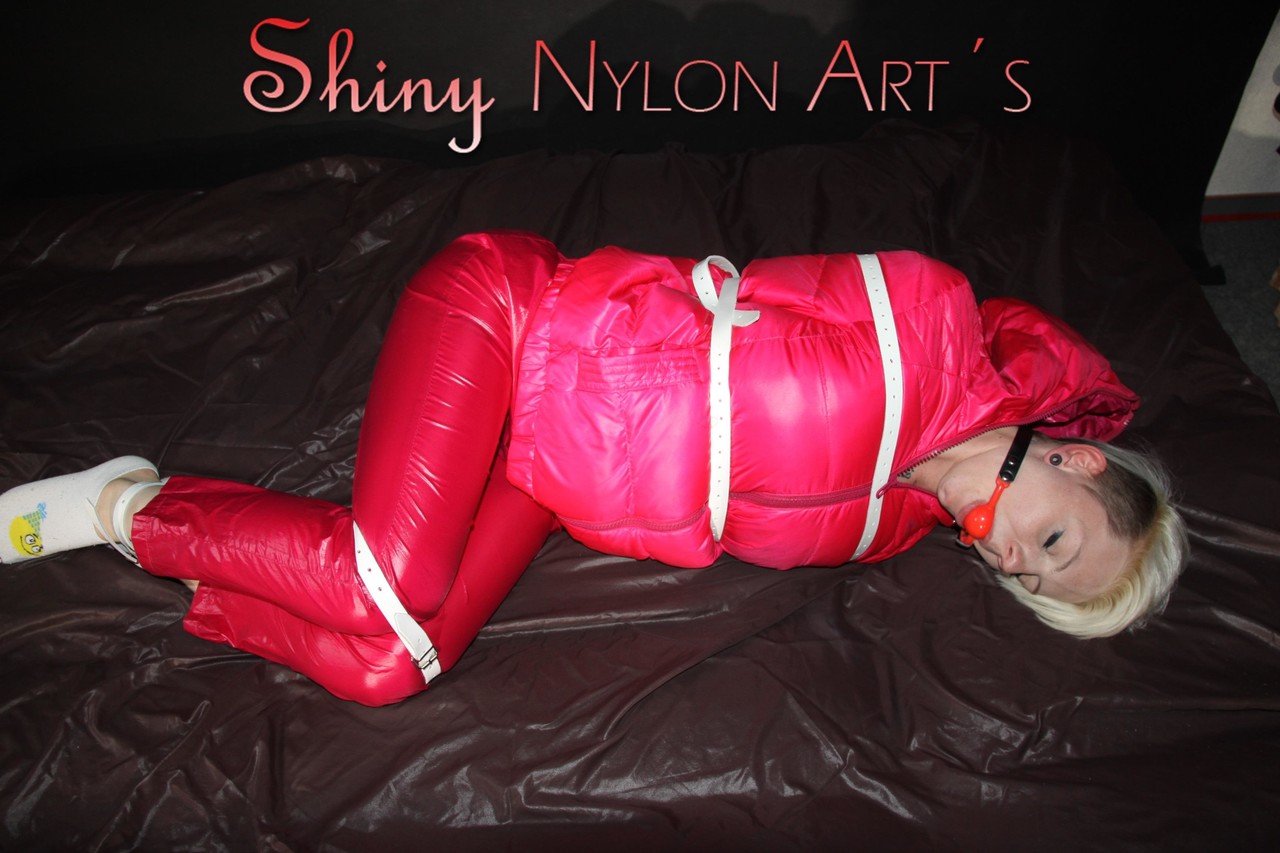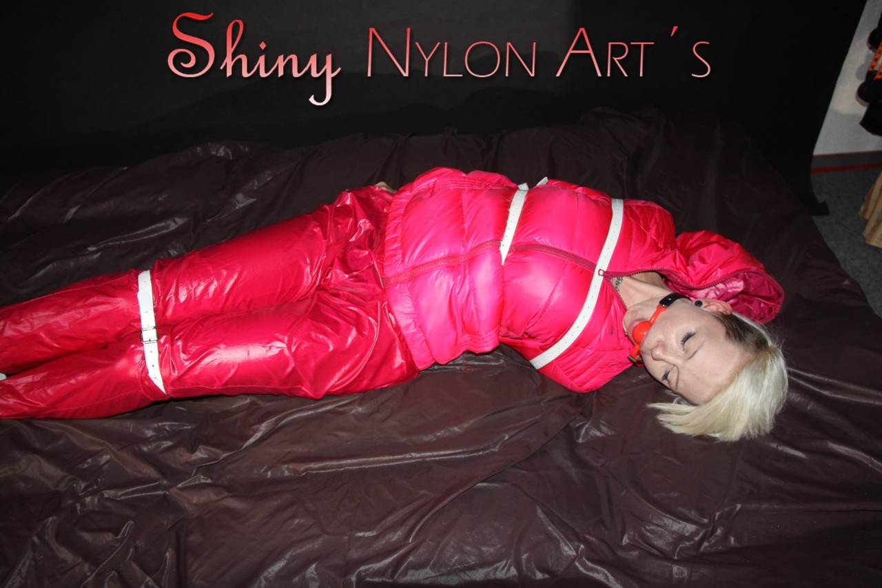 गोरी चिक पिंक डाउन जैकेट और रेन पैंट में बंधी और मुंह बंद की गई - गैलरी जानकारी