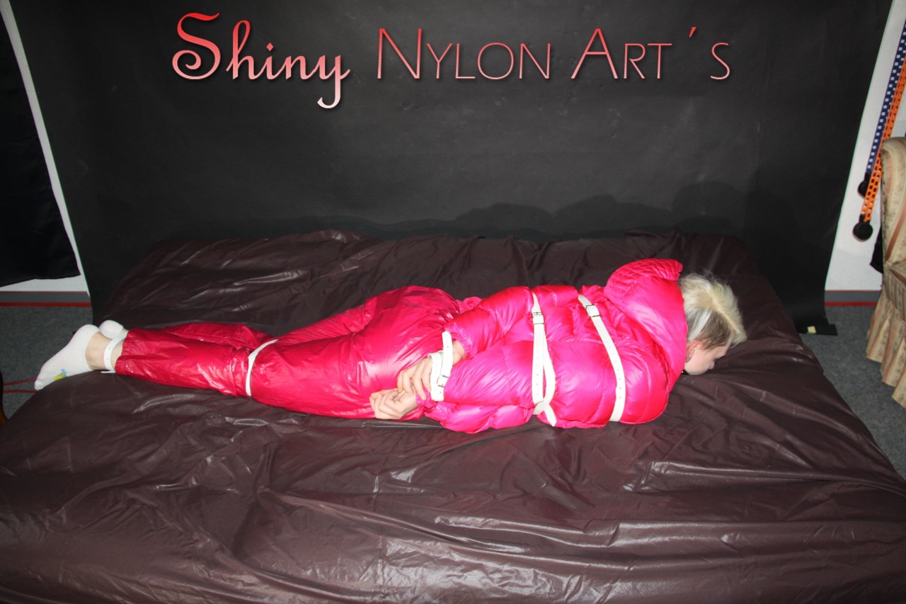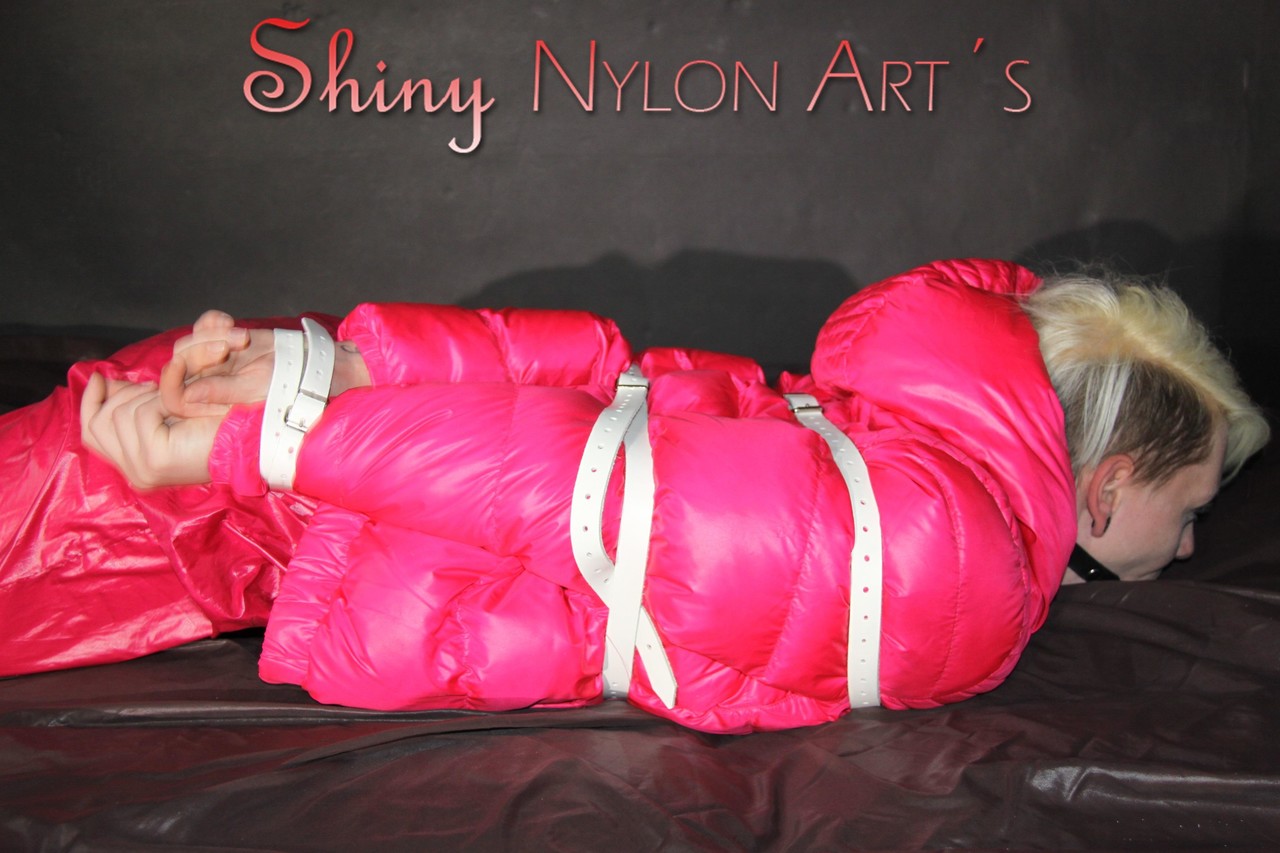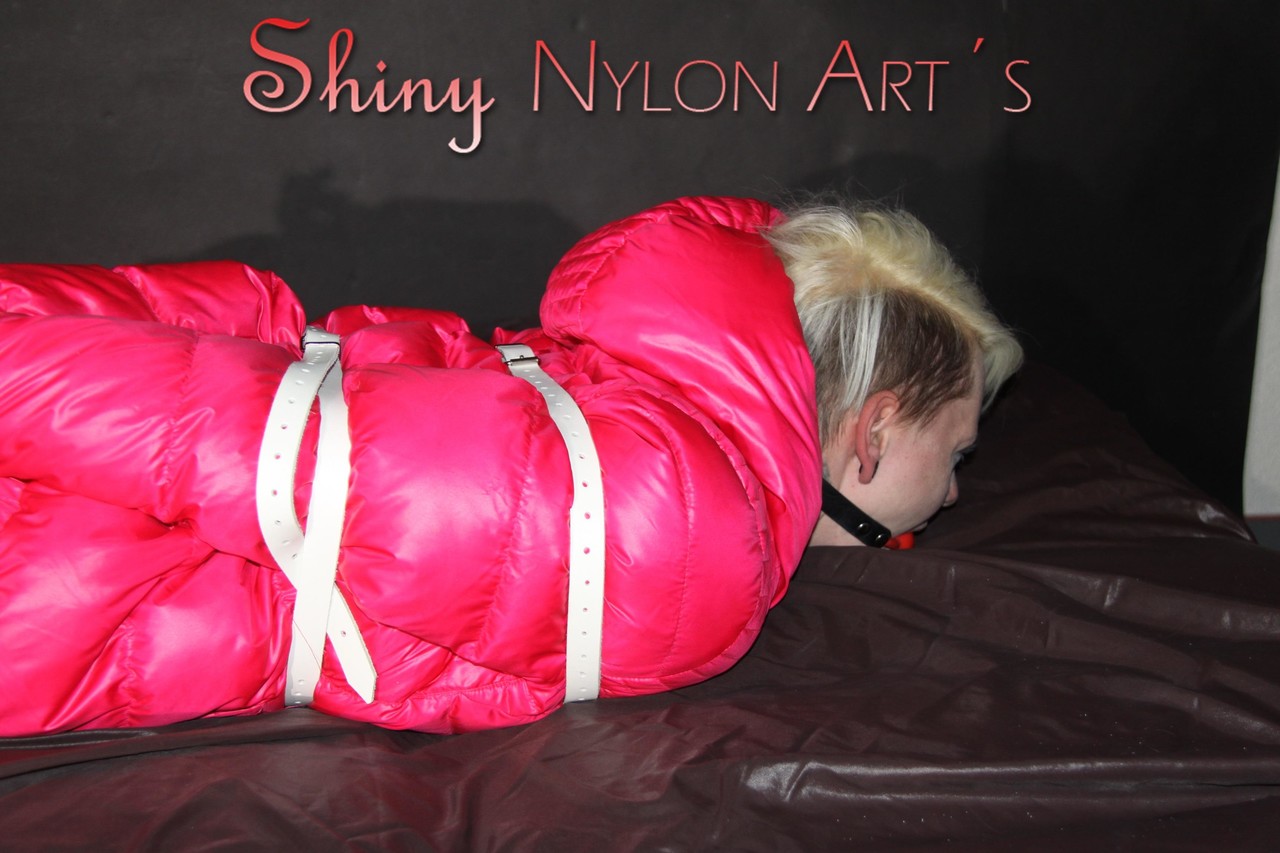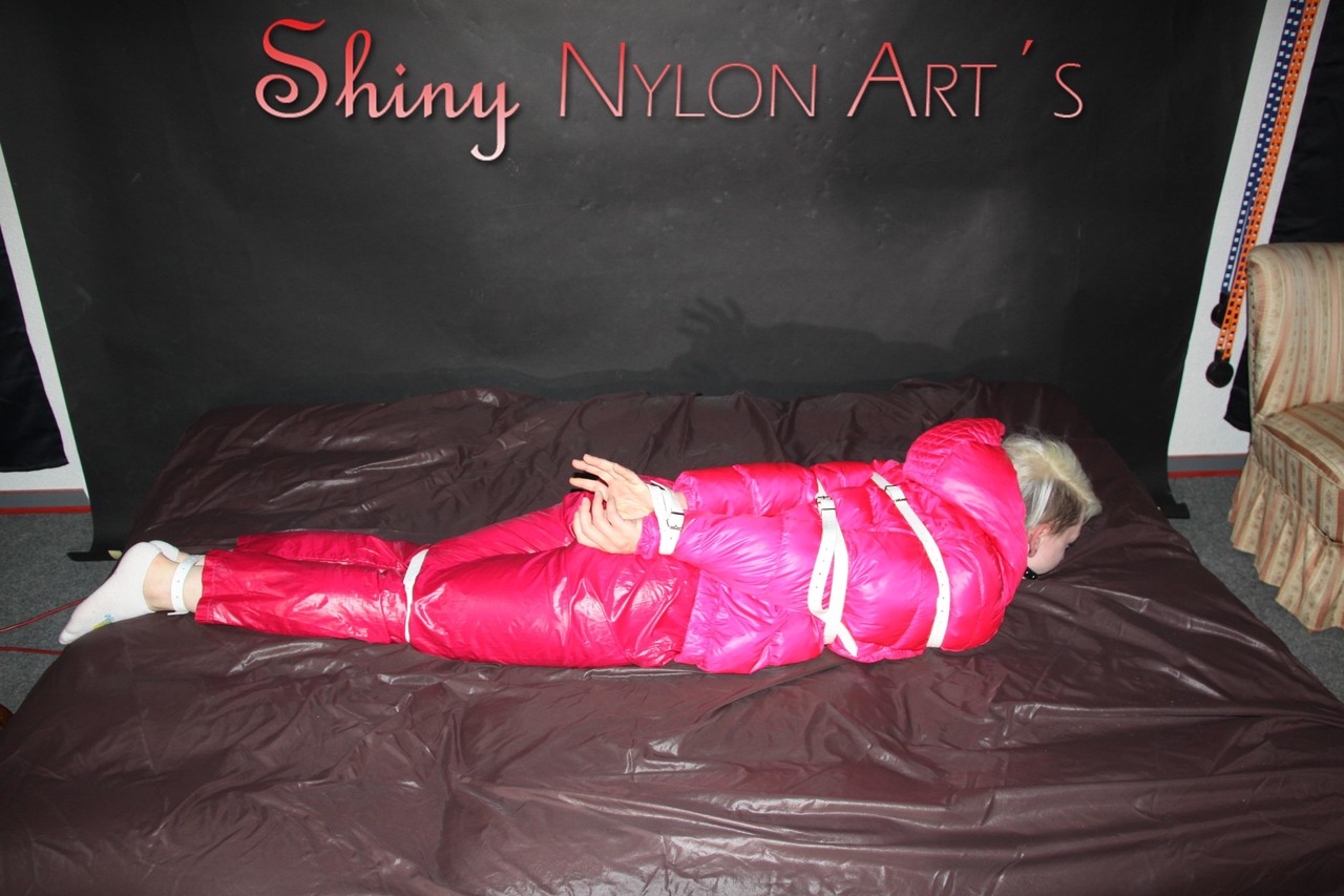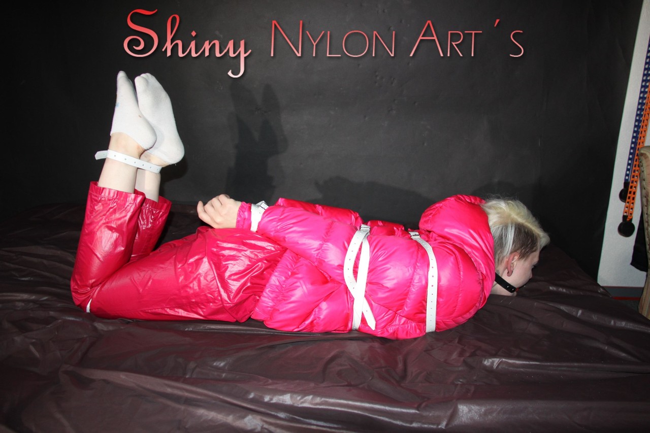गोरी चिक पिंक डाउन जैकेट और रेन पैंट में बंधी और मुंह बंद की गई - गैलरी जानकारी