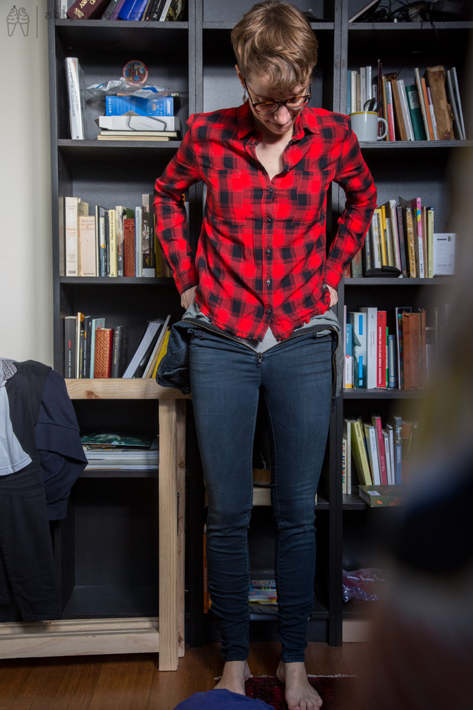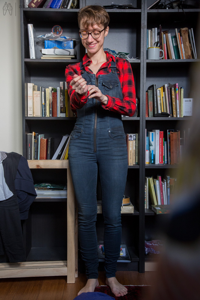 दुबली शौकिया ग्रेचेन लाइब्रेरी की अलमारियों में कपड़े पहनती है