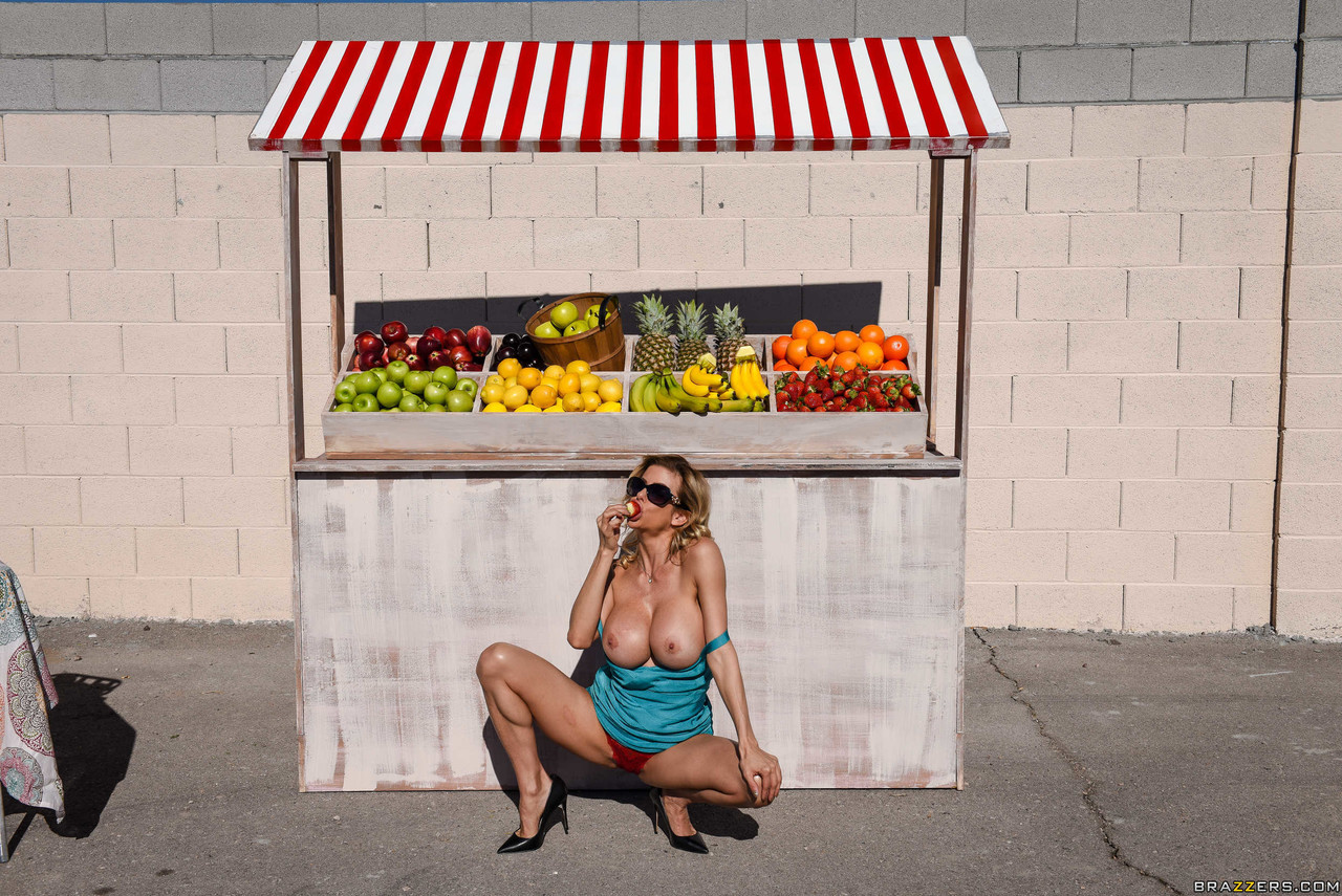बड़े स्तन वाली ब्लोंड मिल्फ एलेक्सिस फॉक्स एक आउटडोर रियलिटी स्ट्रिपटीज़ में अपने नकली बड़े स्तन दिखाती है, देश की लड़की के रूप में घाघरा, पेंटी, चश्मा और हाई हील्स पहने हुए।