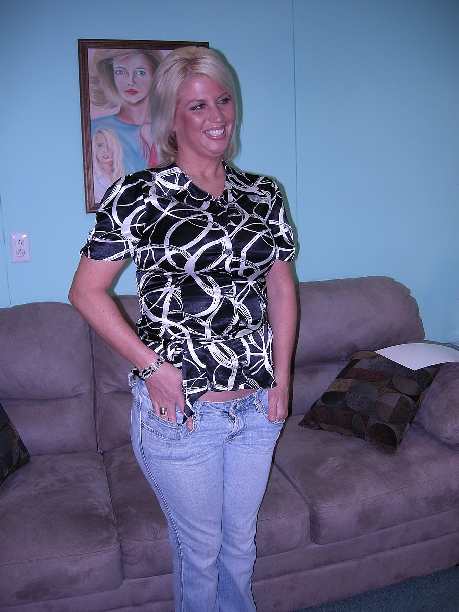 मोटी ब्लॉन्ड एमआईएलएफ एलेक्सिस एंडरसन जींस से अपने बड़े自然 स्तन, मोटी जांघों और शेव्ड योनि को दिखाने के लिए स्ट्रिप्स करती है, कास्टिंग शूट में।