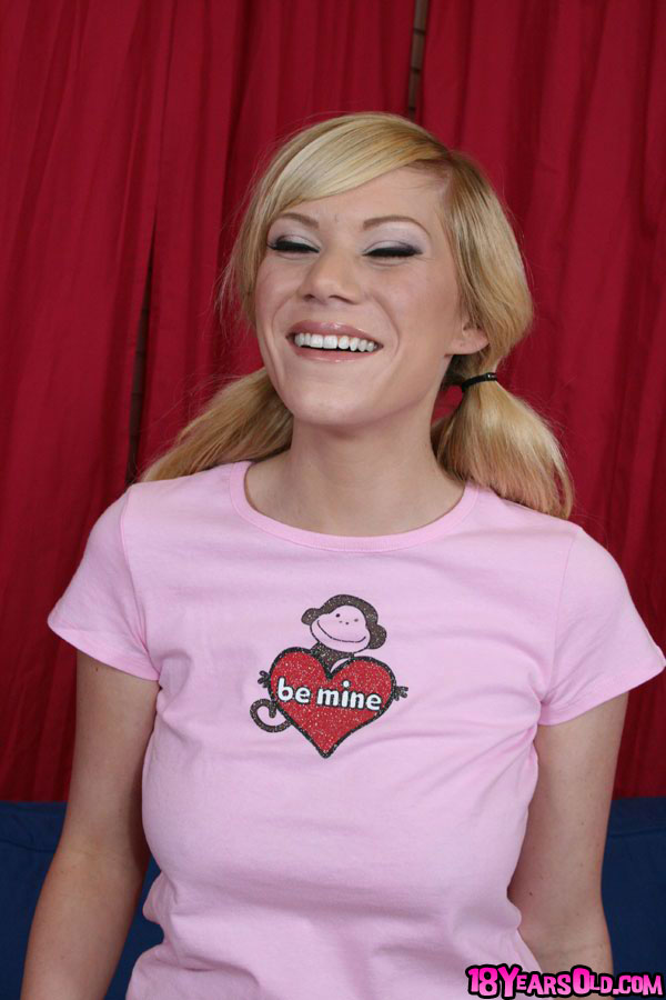 Pigtail blonde Sascha Sin teases off her panties to bare shaved pussy and big teen tits in close-up solo delight.