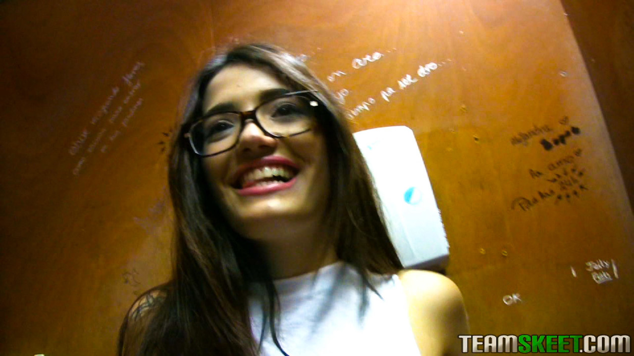 चश्मा पहनने वाली काली बालों वाली नर्ड पेनेलोपे कम बाथरूम सेक्स के लिए नकद लेती है - गैलरी जानकारी