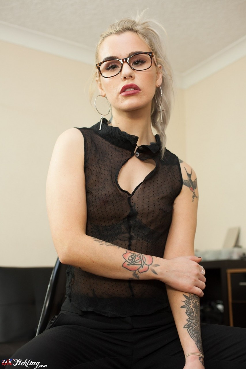 Watch classy tattooed blonde Jade tease in pigtails, glasses, and office attire as she slips off her high heels, revealing stocking-clad feet in this non-nude, fully clothed solo gallery.