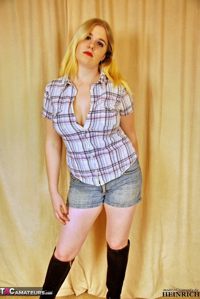 Blonde PAWG amateur teen strips nude in knee-high boots, flaunting tight ass and tiny natural tits in her first erotic photoshoot.