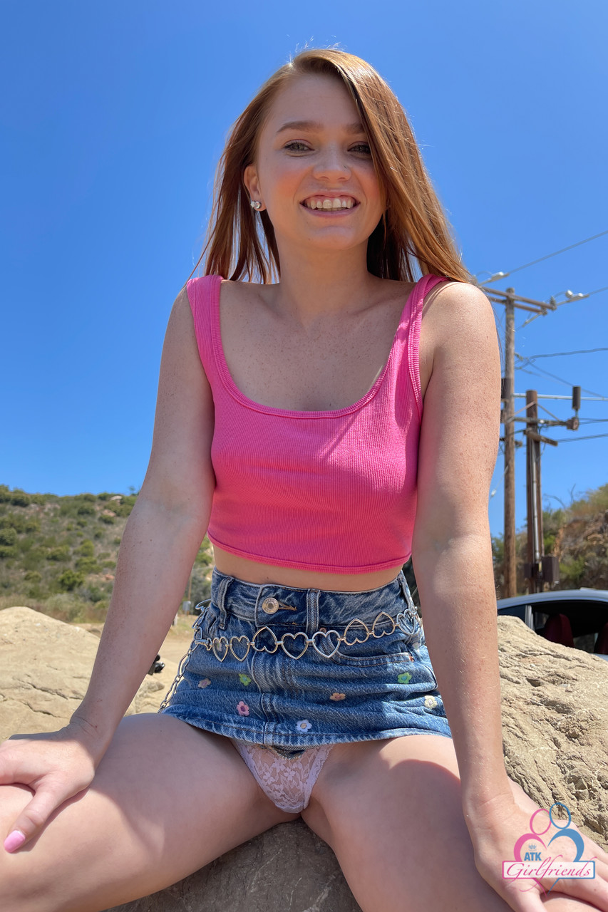 アマチュアのガールフレンドMazy Myersが自然の中で全裸になり、大きなクリトリス、完璧な足、開いたマンコを車の中や屋外で撮られた熱い写真で自慢する。