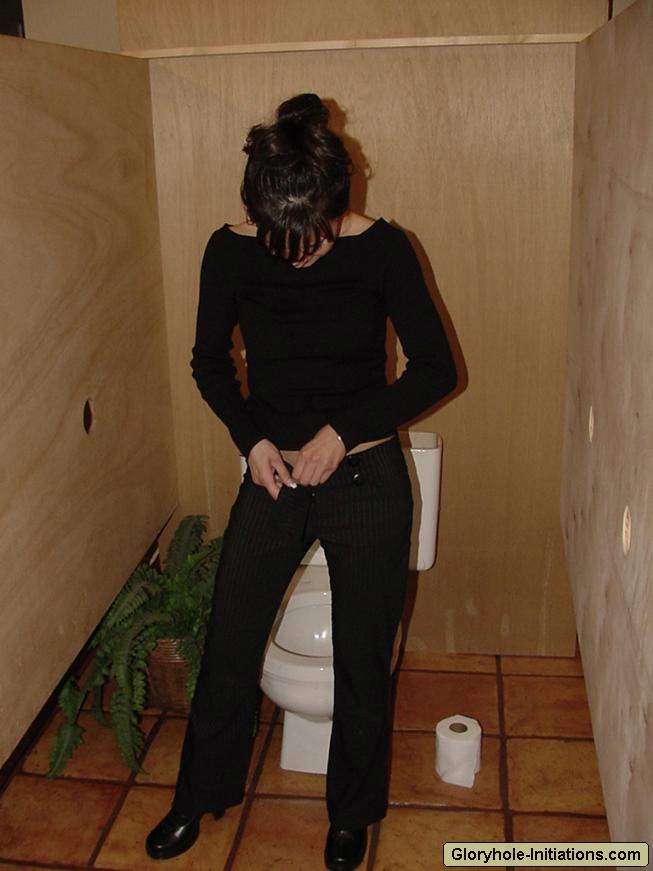 黒髪の美少女はグローリーホールの前に跪き、玉をしゃぶり舐め回して濃厚な精液を開いた口にぶちまけられる;アヘ顔の笑顔から精子が滴り落ち、パンティは脱がないまま。