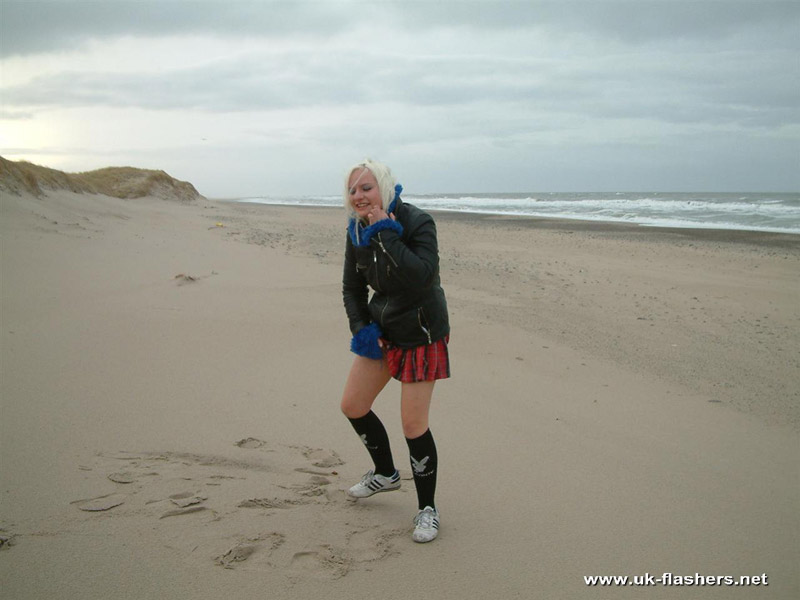 金髪のセクシーなお姉さんがビーチの砂丘の草に小便する、スカートの中から小さな乳房と剃毛されたマ○コを見せつける、パンツはなし、セクシーな足と靴下が濡れる。