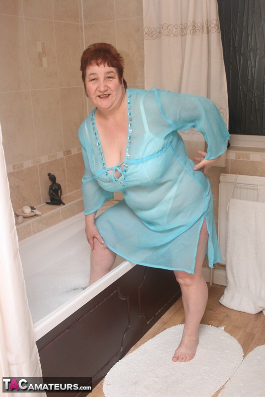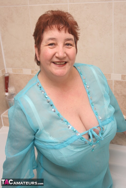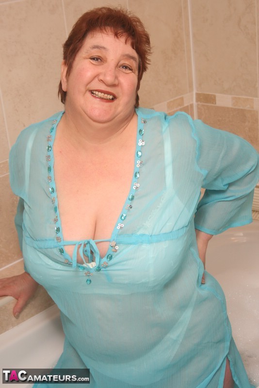 変態赤毛のグラニー・キャロルは、太った完全着衣のBBWボディを浴槽に浸し、濡れたパンツとしわだらけの曲線を広げて、濡れた成熟ランジェリー愛好家のために。