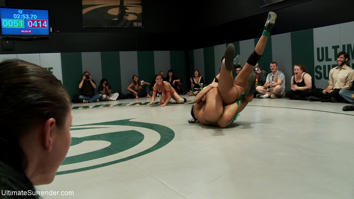 ブリン・ブレイン、ドラゴンリリー、イザマール・グティエレスが激しいアルティメット・サレンダーのレズビアン・レスリングで対決。ハードコアBDSMボンデージ、顔面騎乗支配、ジムでの豊胸アクション。