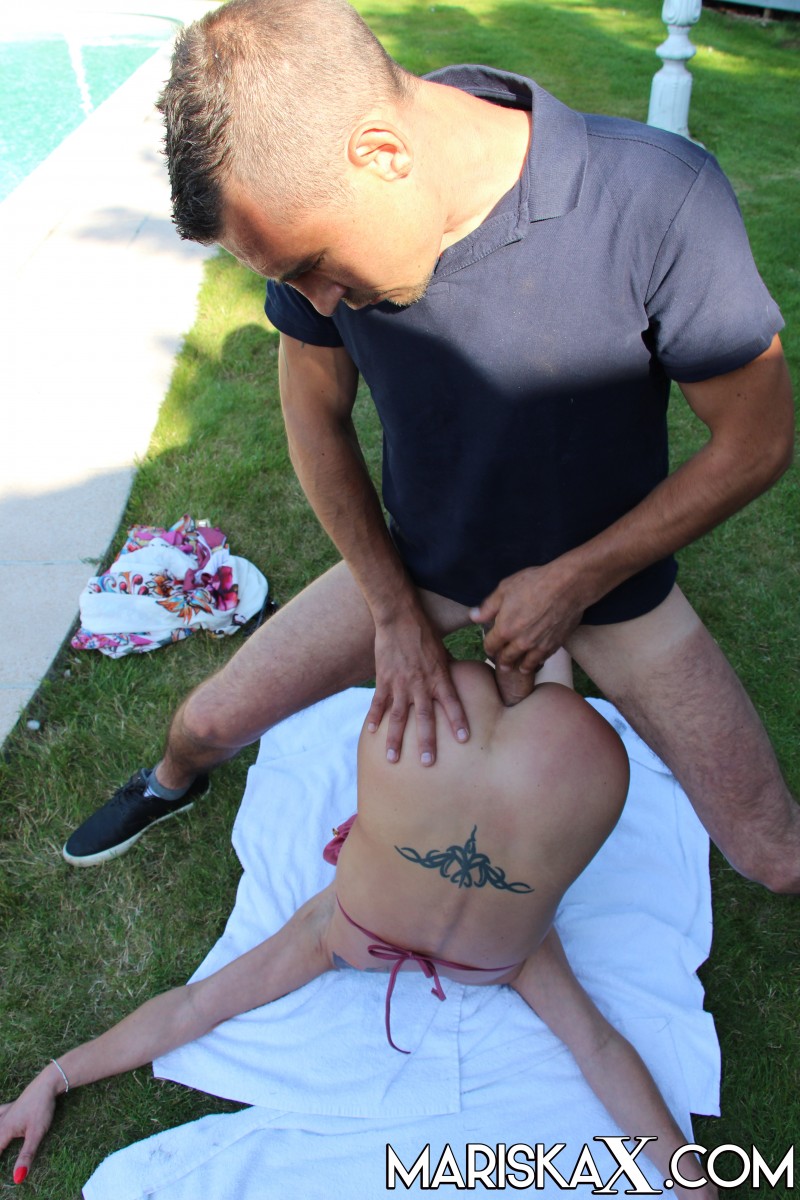 長い足の美女ニッキークラリスは、プールサイドの芝生でのセックスの後、膣から精液を垂らす - ギャラリー情報