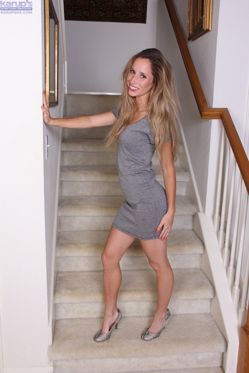 細身のティーンのパイパーキャンドルウィックが階段で体の 緊い夏のドレスを脱ぎ、パンティをはね、素人アマチュアのマンコを広げ、かわいい足をこのヌードソロギャラリーでフラッシュします。