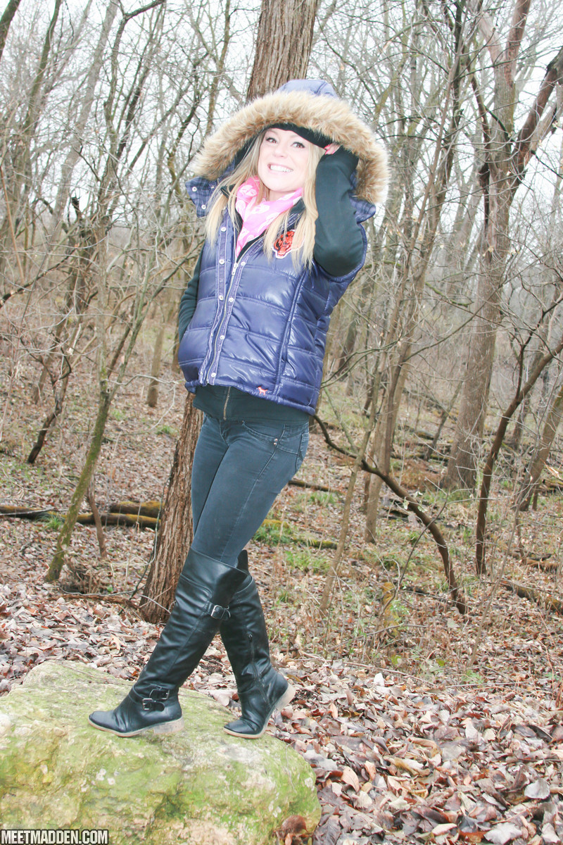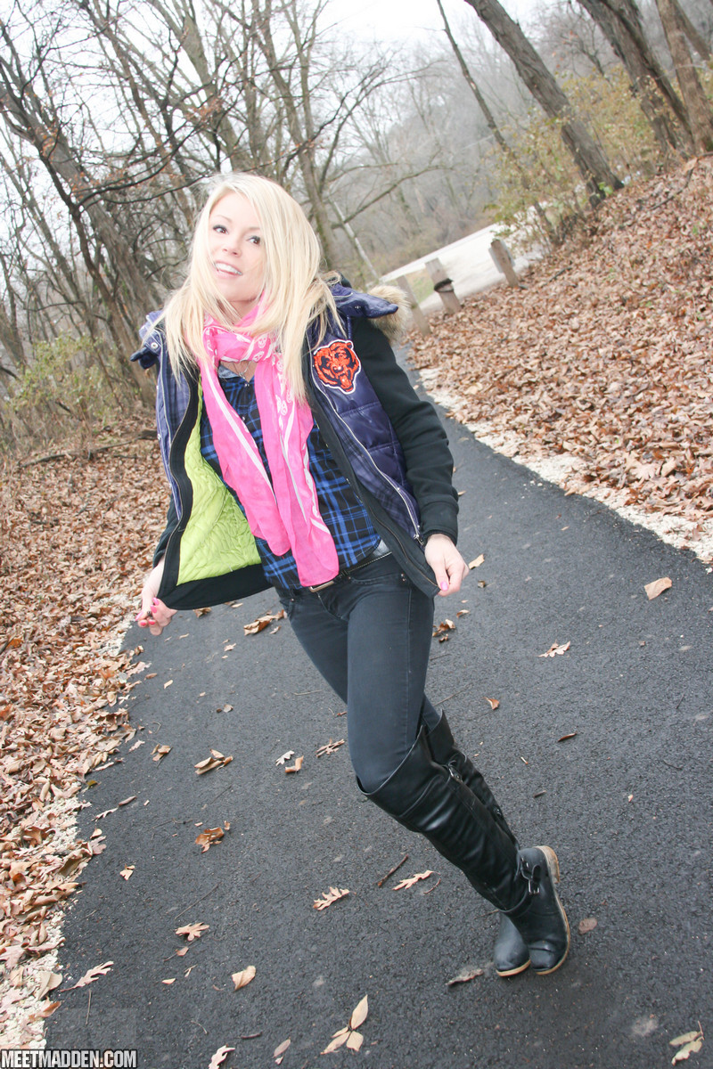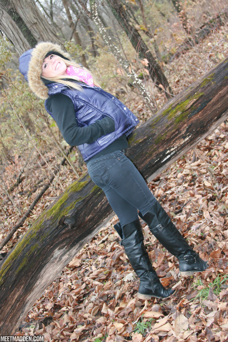 アマチュア金髪人妻Meet Maddenが寒い野外撮影でタイトジーンズとピンクブラで挑発し、ビキニまで脱いで林のソロファンタジー。