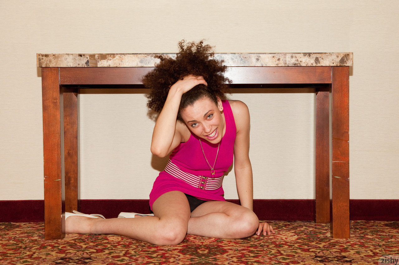 素人ギャル Loretta Woods がピンクのミニドレスで美しい長脚を見せつけ、ホットな裸女スタイルでソロで股間を熱くする。