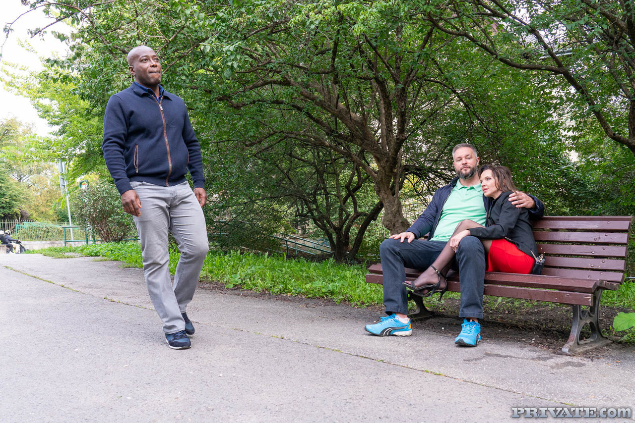 小柄な美熟女ミア・カプリが野外でワイルドなBBC輪姦に参加、締まった身体を見せつけて複数の男にフェラし開脚する。