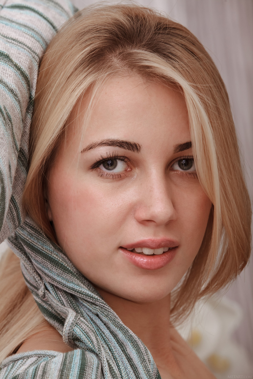 金髪のティーンモデル、アダージョが、豊かな恥毛をアップスカートで見せつけ、脚を開けて、ふくよかな乳首と大きいクリトリスを、豪華なソロ写真で披露する。