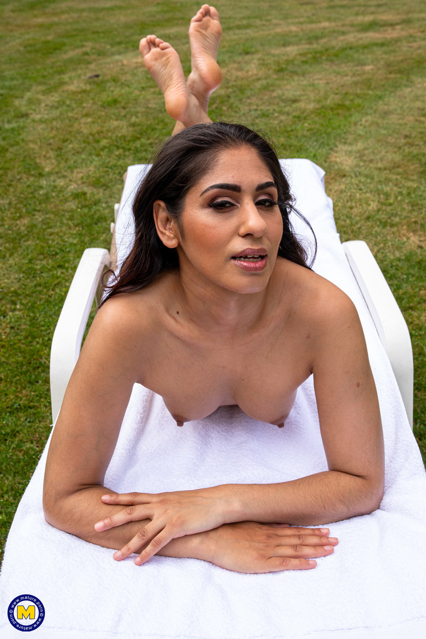 イギリスの黒髪熟女サハラ・ナイトが屋外で青いビキニを脱ぎ、50代の蒸し暑いギャラリーで毛深い熟したマンコとセクシーな脚を露出する。