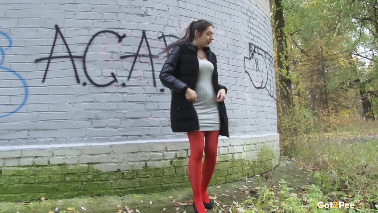 ダイアナは建物の後ろでスカートをめくり、赤いタイツを脱いで公の場でおしっこをする;剃毛された陰部が近距離の野外おしっこシーンで開く。
