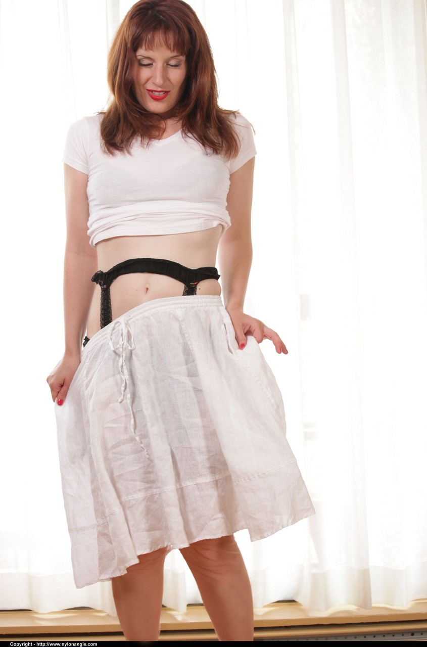 汚いアンジー、年上の女性、彼女のスカートを脱いで、半透明のパンティーとタンのナイロン - ギャラリー情報