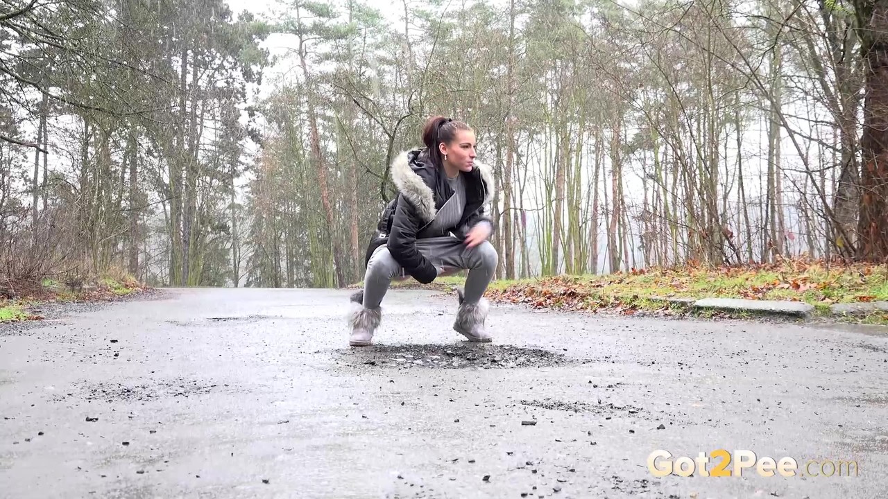 ヴィクトリア・ダニエルズが冬ブーツで道路に緊急で小便する - ギャラリー情報