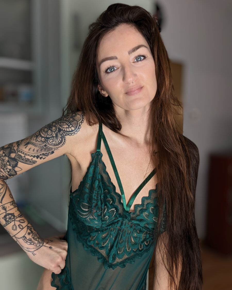 甘い瞳の赤毛美女ララ・ローレンが緑のランジェリーで挑発、スレンダーな完璧なお尻とセクシーな足をアマチュアのタトゥーベイブ好きに披露する。