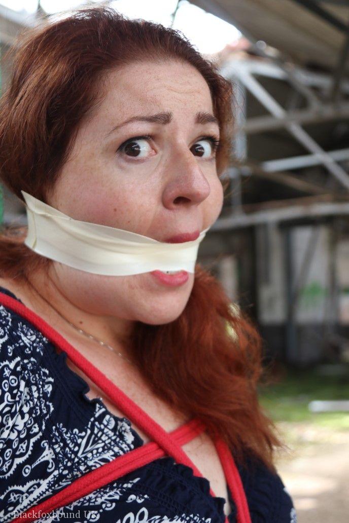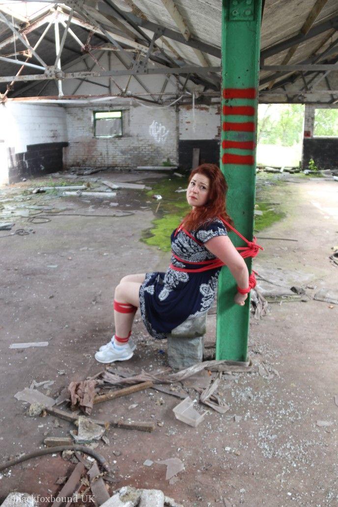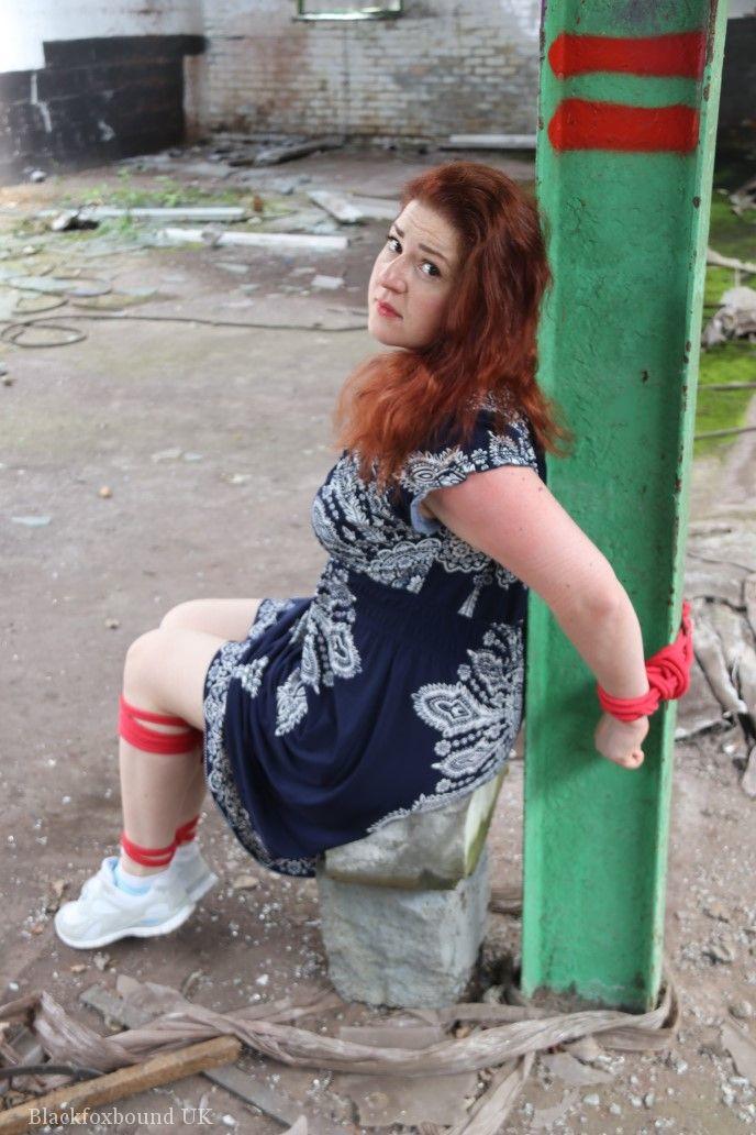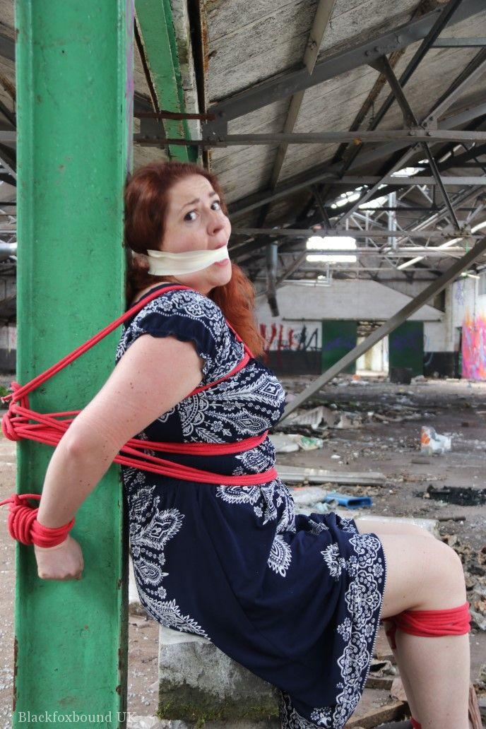 赤毛のBBWが倉庫の柱に縛られ、口をふさがれています。タイトなスカートを着用し、厳格なBDSMの緊縛に絶望的に抵抗しています。