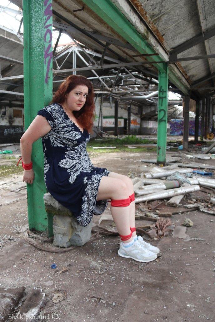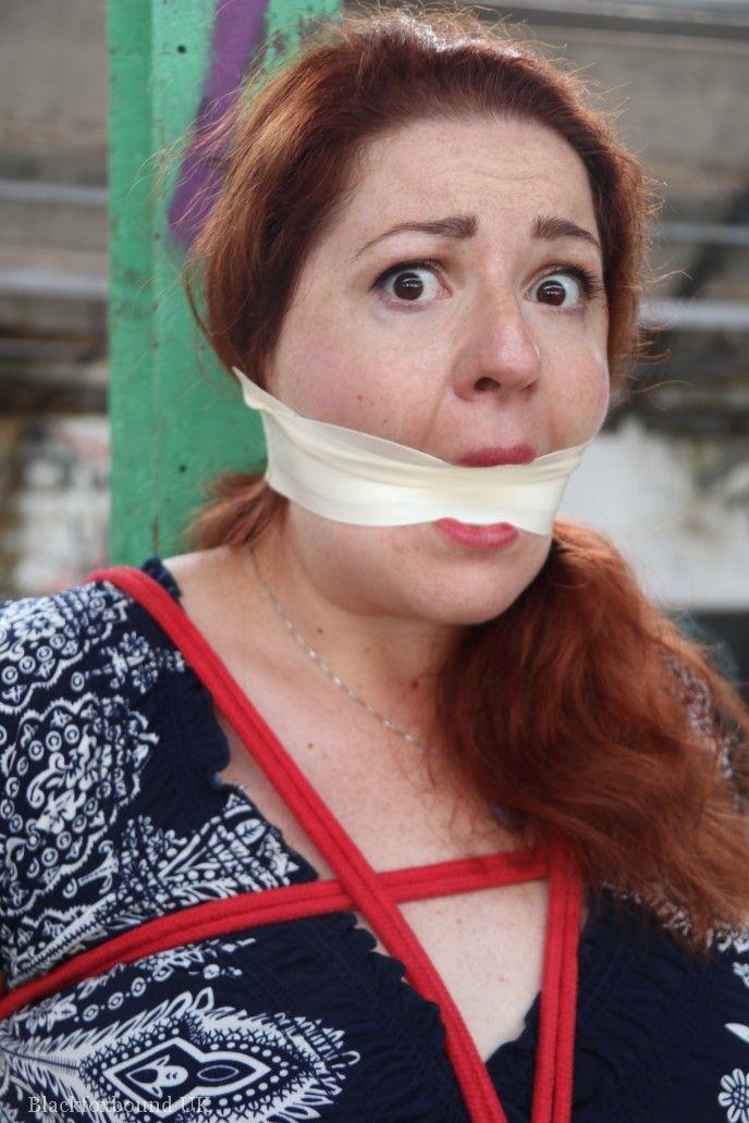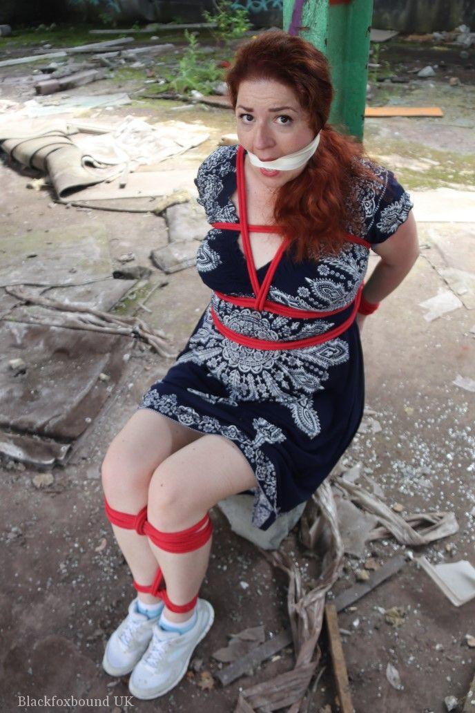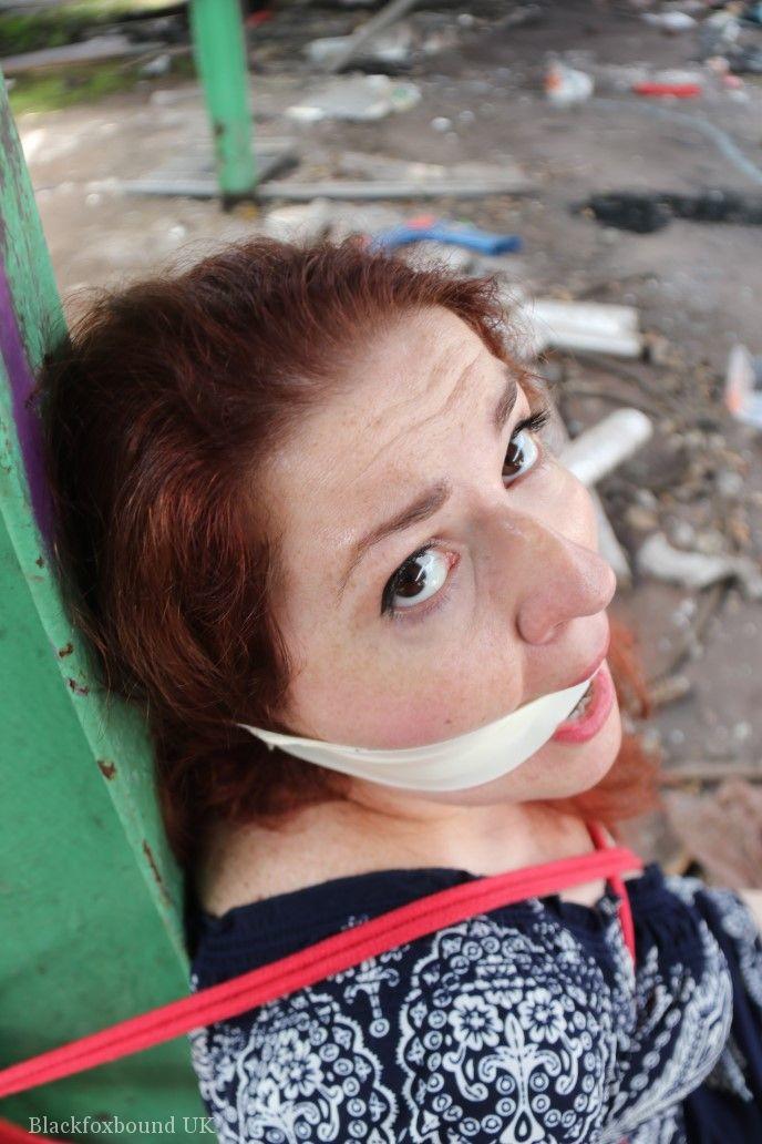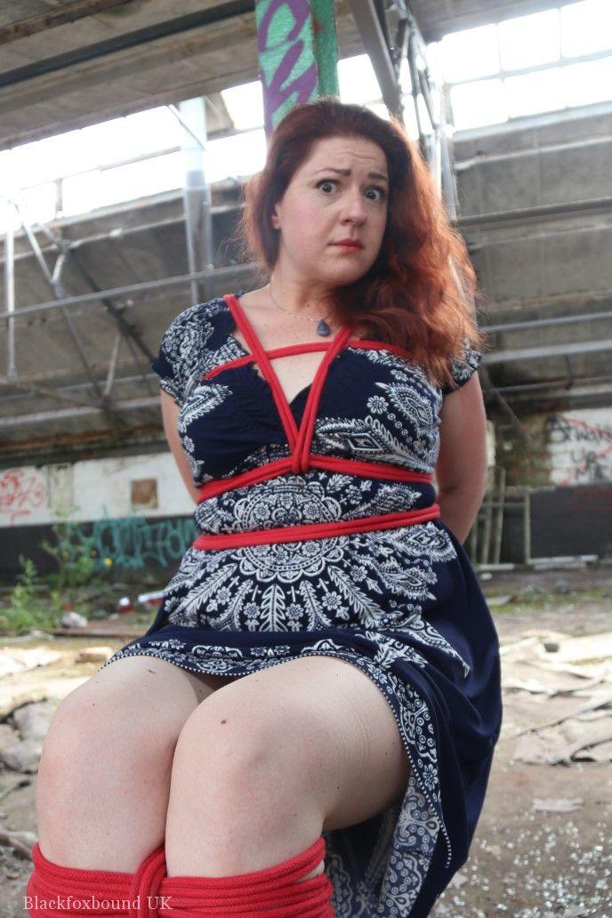 赤毛のBBWが倉庫の柱に縛られ、口をふさがれています。タイトなスカートを着用し、厳格なBDSMの緊縛に絶望的に抵抗しています。