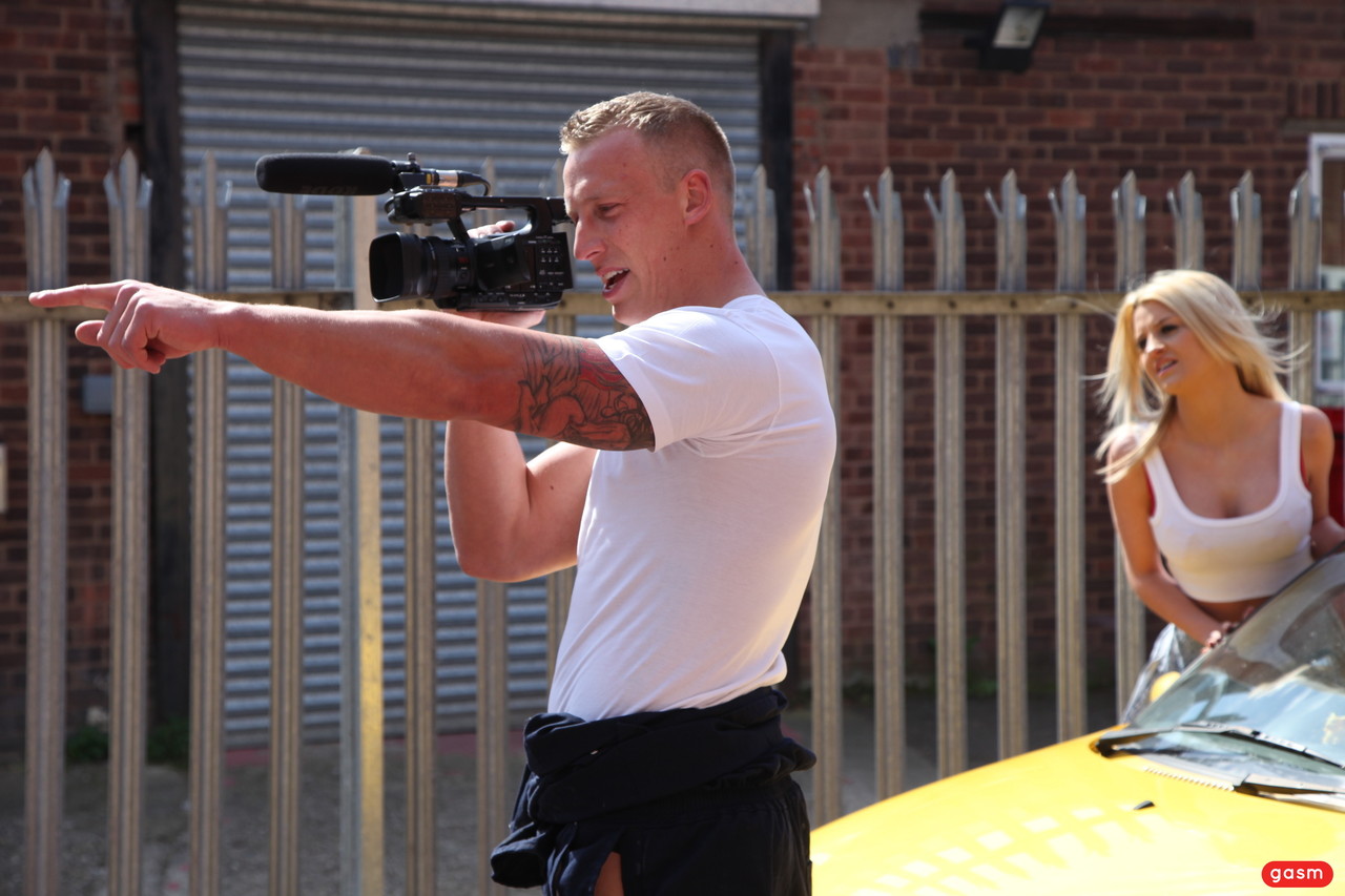 小柄なイギリスの金髪ポルノ女優シエナ・デイが極短デニムスカートとハイヒールで屋外でアップスカートを見せて挑発する。