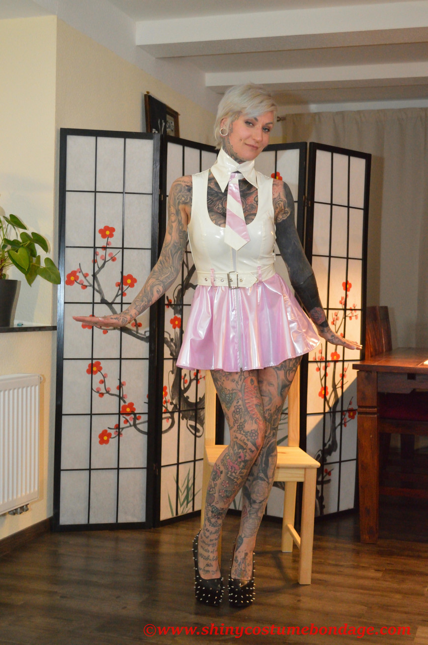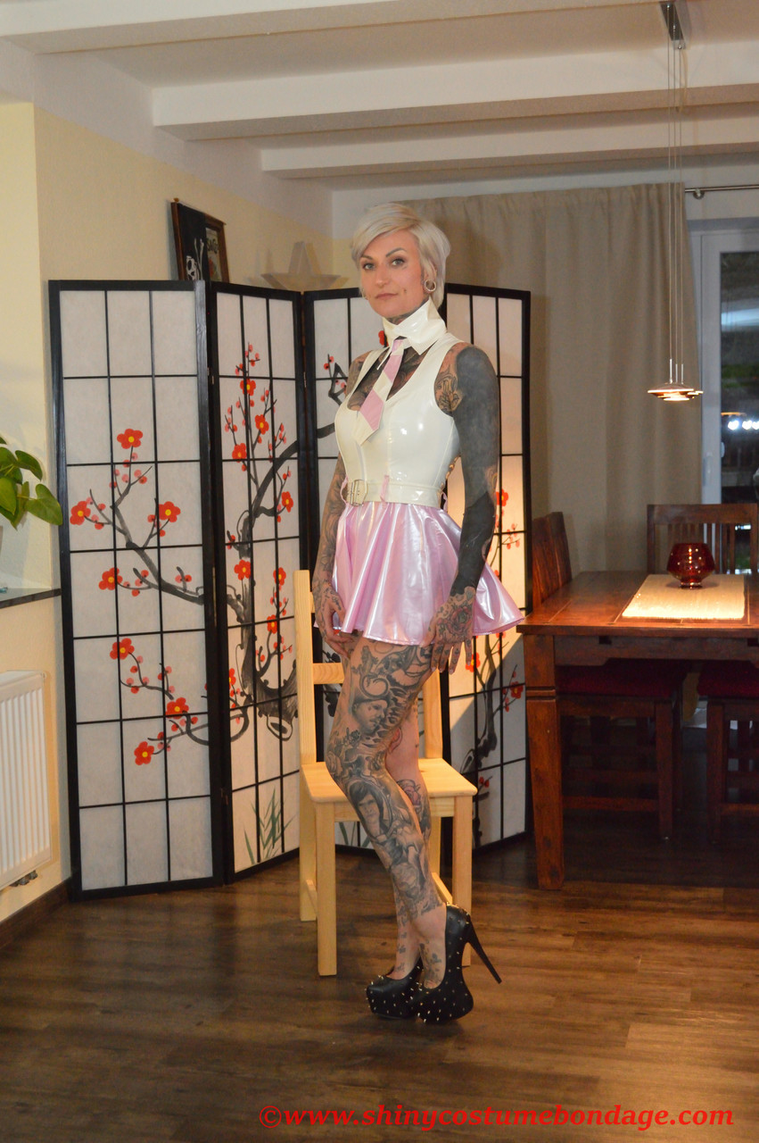 タトゥーの入った金髪の爆弾娘フランシーヌ嬢が、ピッタリしたラテックスドレスの上にスリークなレインコートを着てイタズラ、フェティッシュスタイル、ハイヒール、そしてタトゥーの入った曲線をこのスチームなノンヌード制服ギャラリーで披露している。