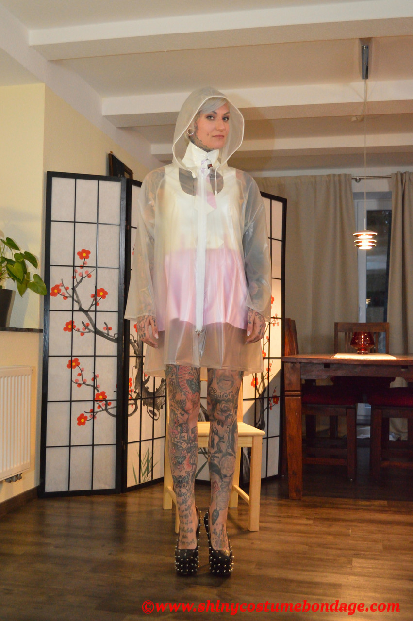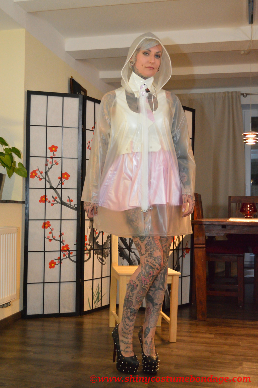 タトゥー入りプラチナブロンドのミス・フランシーヌ レインコート姿でラテックスドレスの上に - ギャラリー情報